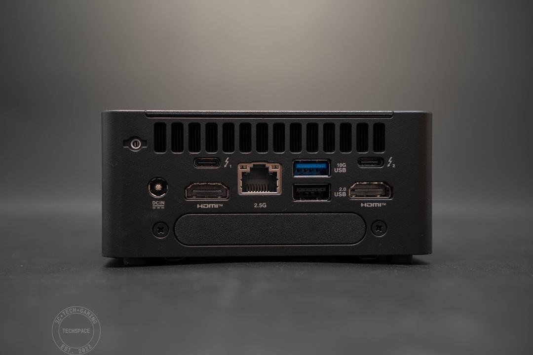 機身後方 I/O 部分則是除了有電源供電孔外,另有兩組 HDMI 2.1 TMDS (4K@60Hz) 顯示埠、兩組 Thunderbolt 4 連接埠、USB Type-A 10Gbps 和 2.0 各一組,網路部分則是有 2.5GbE LAN,另外搭配 Wi-Fi 7 和藍牙 5.4。影像部分藉由 HDMI 和 Thunderbolt 的組合最多可提供四組 4K 螢幕畫面輸出。