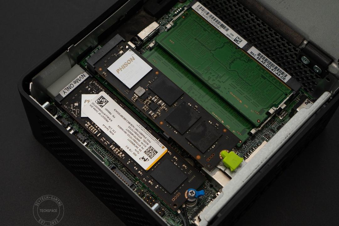 主要零組件空間布局包含兩組 DDR5 SO-DIMM 插槽、一組 M-Key NVMe Gen 4×4 (Type-2242) 插槽,最後則是 Gen 5×4 的 SSD 插槽,插槽旁藍色處是免螺絲固定設計,SSD 下方其實另有 Wi-Fi 網卡的安裝位置,可自行調整升級的彈性相當不錯。