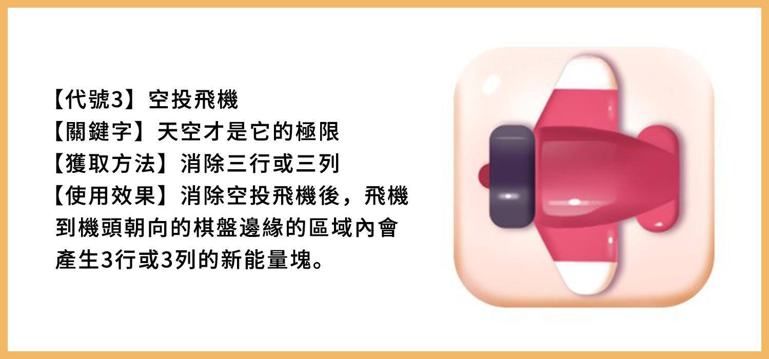 - 「空投飛機」盡量放在棋盤的邊緣,並且讓機頭朝向棋盤內部。當它被消除時,才會產生更多新方塊。