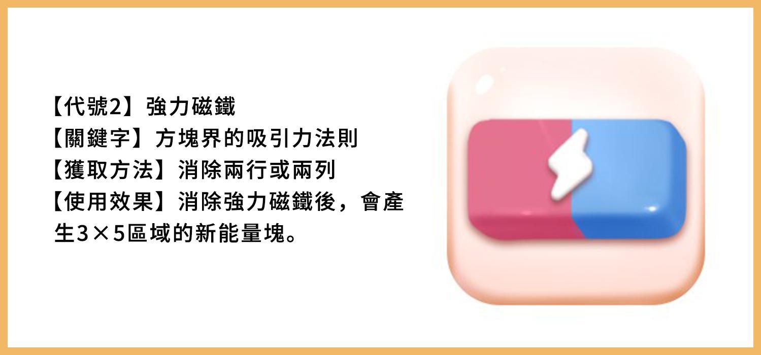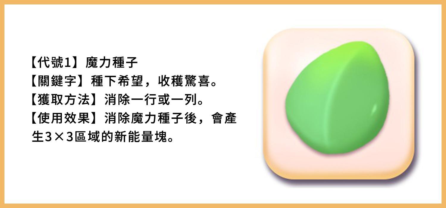 消除訣竅- 「魔力種子」和「強力磁鐵」盡量放在棋盤角落,或【雖有空位但難以擺放新方塊】的位置,當它們被消除時,這些空位就能順利被新方塊填滿。