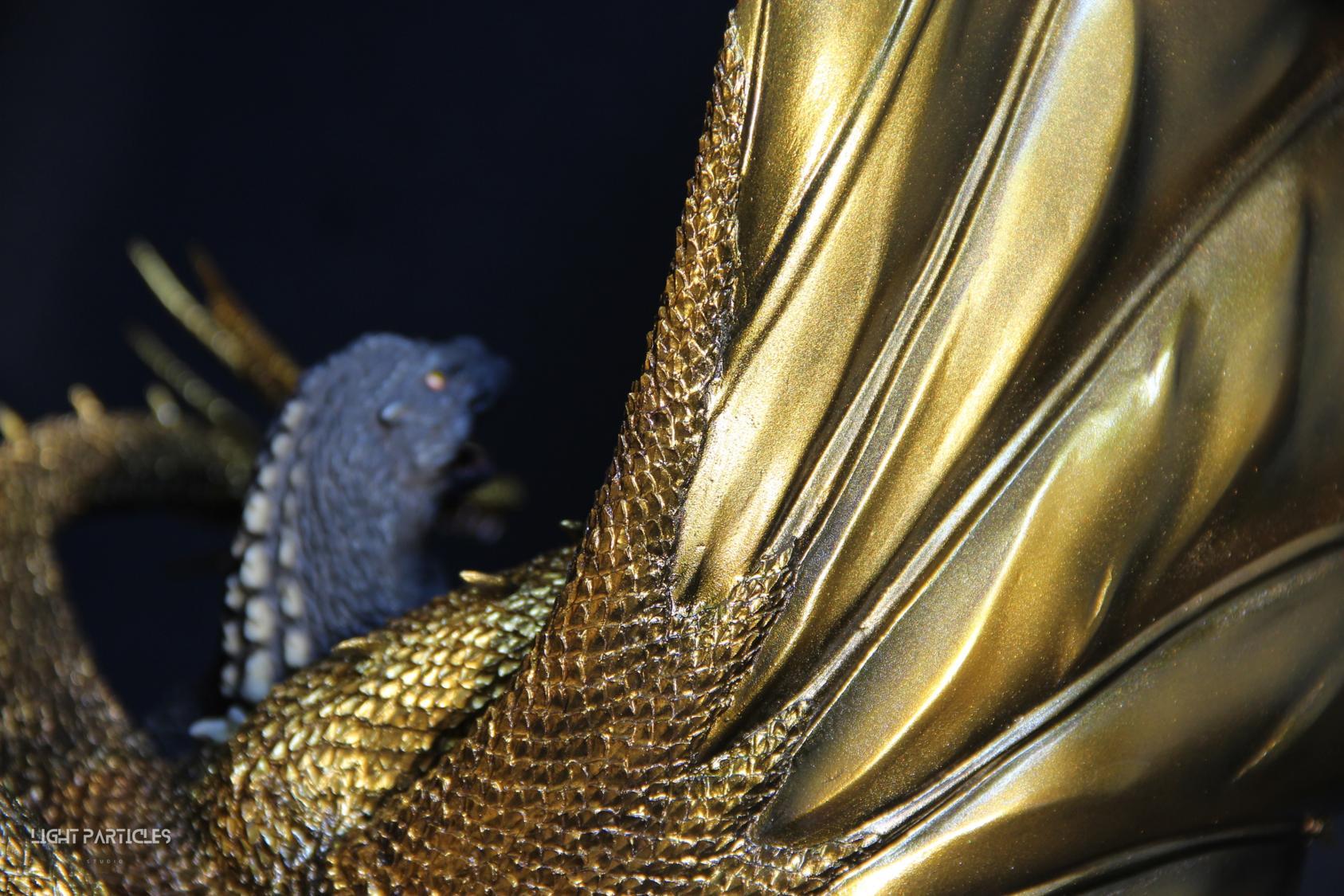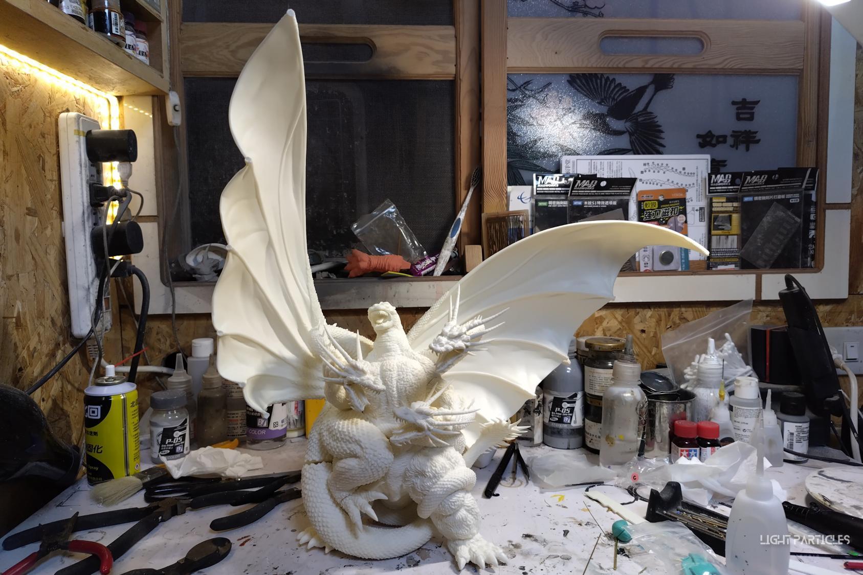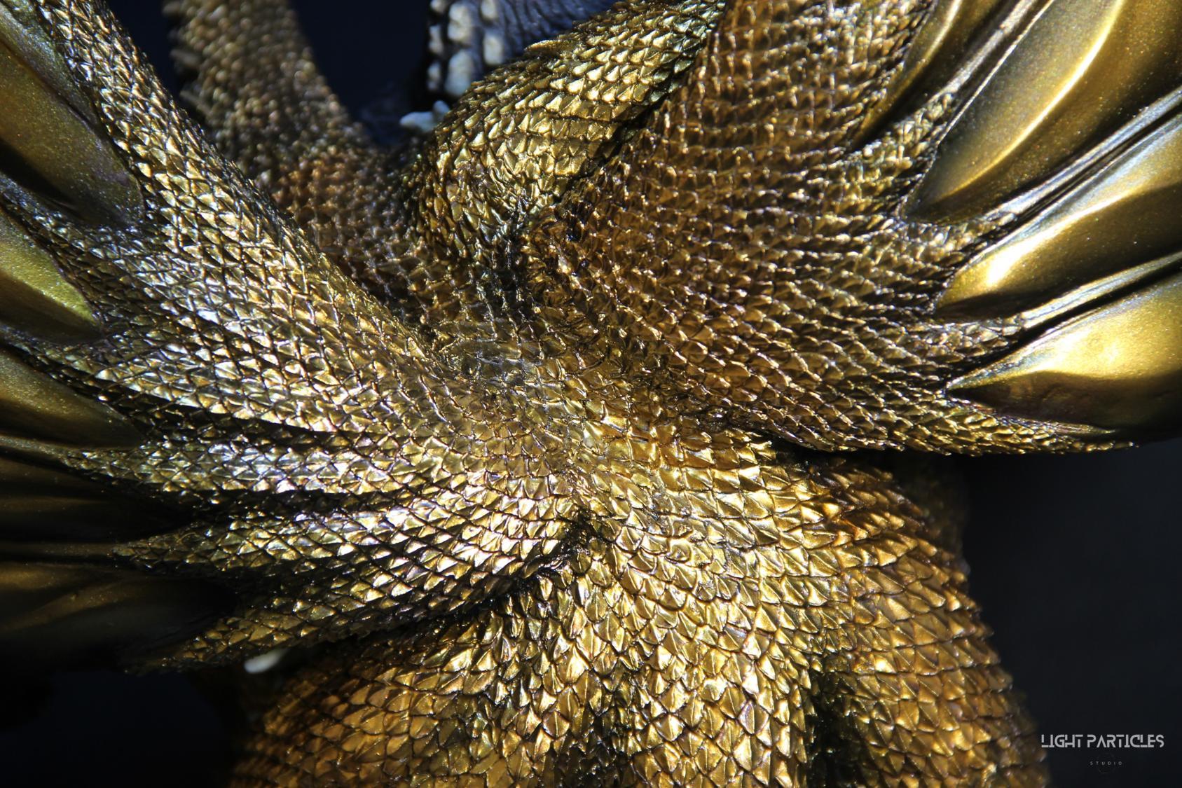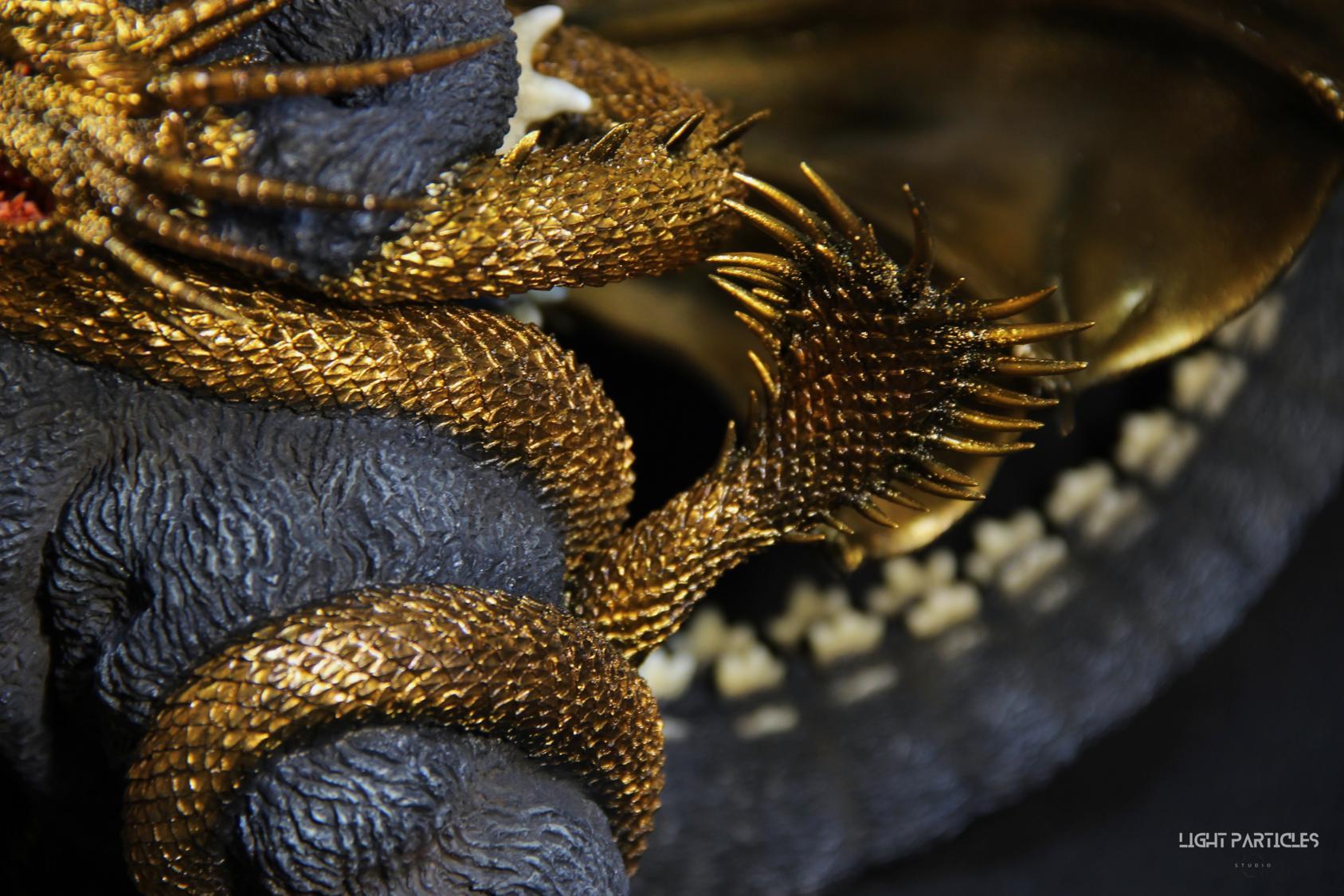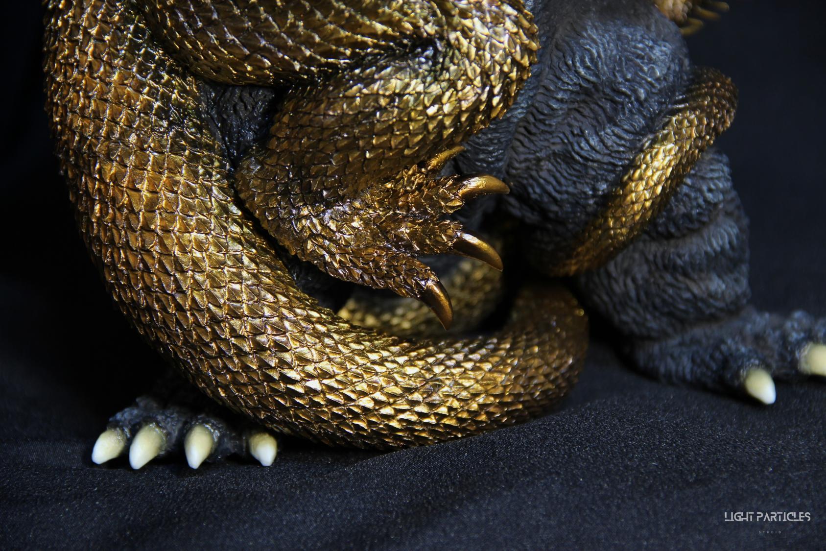 這組經典款套件是在2022年再次販售的版本,初版是1997發售。當時入手後一直放在倉庫內,經客戶詢問後,便選擇讓出並根據委託需求進行上色。第一次製作酒井的套件,所以進行比較仔細的紀錄。經過之前製作D-tech Q版後,本想這組套件應該不會再遇到密合度跟缺肉的問題,但還真是遇到了(苦笑)。除了將密合度修復外,還需要將基多拉的鱗片進行重新雕塑補齊,把紋理接順,這組套件真的花不少時間在基多拉紋理重製上。最後,根據客戶需求使用銅色系金屬漆對王者基多拉噴塗上色。透過透明色系增加層次外,也用砝瑯漆把層次洗出來,增加整體的厚重感。套件本身翻模的顏色很適合保留下來在牙齒與指甲部位,塗裝後讓這些部位保留半透明感。很開心能把這套經典套件完成,希望大家喜歡~