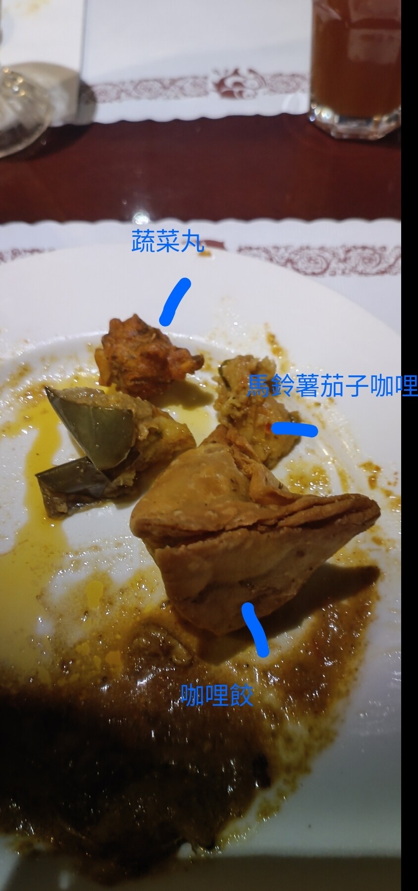 蔬菜丸一言難盡,香菜茴香子與其他香料湊在小小一顆,一口咬下激烈的氣味瞬間爆開,說難吃嗎是不至於只是味道個人不太能接受就是了。馬鈴薯茄子咖哩挺特別的,不過味道也是普普;咖哩餃個頭有夠大,外皮頗厚,內部是各種蔬菜餡料混合著茴香孜然花椒,或許還有肉(?),不過只是最後一盤了,老實說已經吃不太下了,勉強才把這盤吃完。只能說或許是重口+油,所以吃沒多少就飽了,奇怪的是明明感覺比台南常吃的還不鹹,但中途就是會一直想喝水@@
