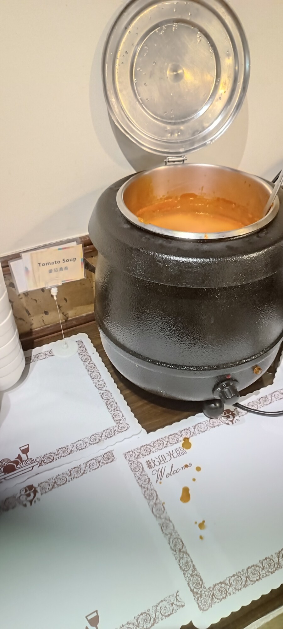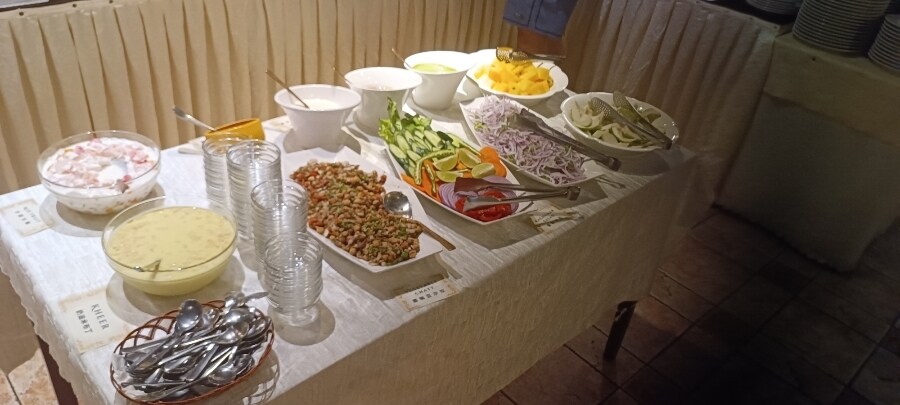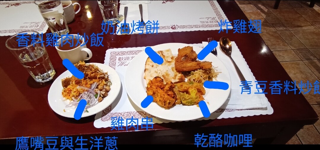 第一輪先拿這樣,奶油烤餅好好吃,整場下來至少拿了7張餅皮了,餅皮淡淡的奶油味,但比起奶油,個人感覺更像是乳酪起司的味道;炸雞翅肉質軟嫩,但外皮超硬超酥,說是殼都不為過,不知道這樣的做法是正常的嗎?烤雞肉串感覺普普,肉似乎有點太乾了一些;青豆香料飯味道倒是挺香的,還蠻好吃的;香料乾酪咖哩就蠻一般的,跟之前吃過的好像沒什麼差別。鷹嘴豆超鹹的,還帶有胡椒味,不太習慣這種味道。