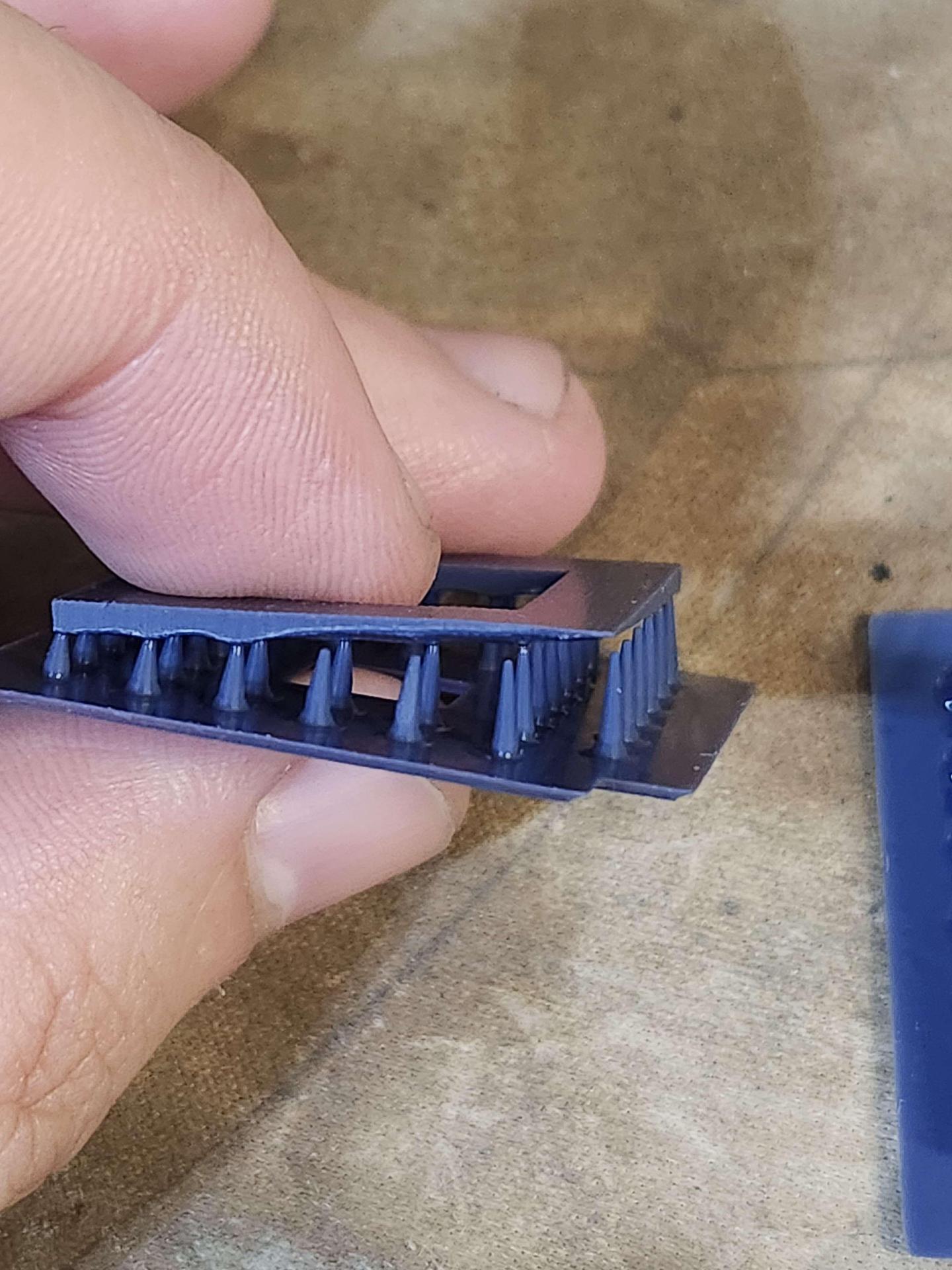 他強度跟PW-100一樣甚至強一些,但相對的他犧牲的韌性及柔軟度的部分,本身性質較為堅固沒錯,但相對的缺點也非常明顯,相較下來性質較脆,先不論在模型方面,個人在將他從載台上面鏟下來就是一個問題,失去了韌性讓他咬的非常的死,若先前載台有傷痕就會變得更加嚴重,移除時不像PW-100以剝離的方式移除,比較像是 [將他從牆上鏟下來] 的感覺,支撐底座也變得不好移除,我就這樣報廢一塊載台...並且在支撐材料根部有明顯的阻力感,我不是太喜歡...