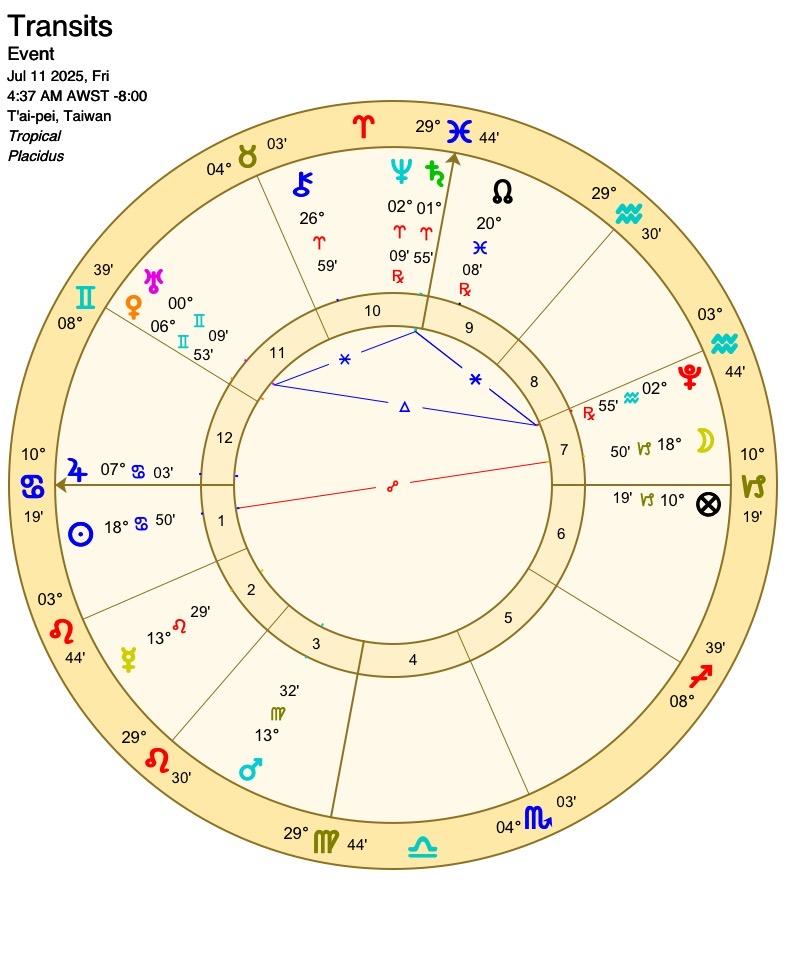 經過充滿情緒力的六月,想必是是幾家歡樂幾家愁,木星移入巨蟹固然是入旺位(Exaltation),但是跟入弱位(Fall)的土星牡羊形成四刑相,木、土、海在開創星座的始度周旋,帶來擴張、矛盾和幻覺的氛圍,同時這個月也緊接著海、土、水停滯與逆行及天王星過運,天王星過運後馬上就會形成天海冥小三角(Minor Grand Trine),頂點為土、海,這種多個外行星的緊密交會並不常見,尤其成為一種和諧的Pattern,但請不要把「和諧」單純想像成「容易」,順暢相位象徵的是星體能量間的暢通,並不意味著世俗的好壞,尤其三王星、土星非意義上的「吉祥」,以現代或靈魂占星的角度它們更是一種「社會集體的共業」。