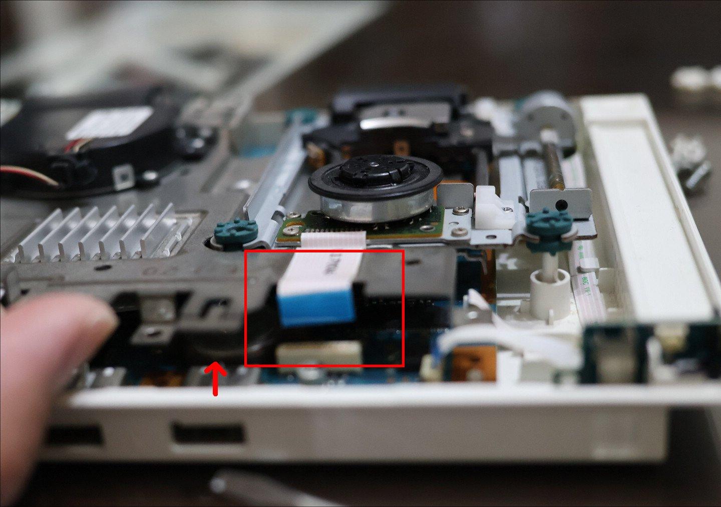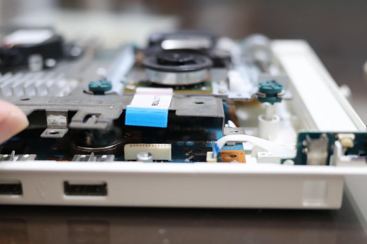 接著把新的電池放回原本安裝的位置,嘗試利用這段縫隙以手指壓上便完成,剩下的就是復原的工作,先鎖上散熱鐵板的三個螺絲,接回光碟機模組軟排,再把機殼蓋上