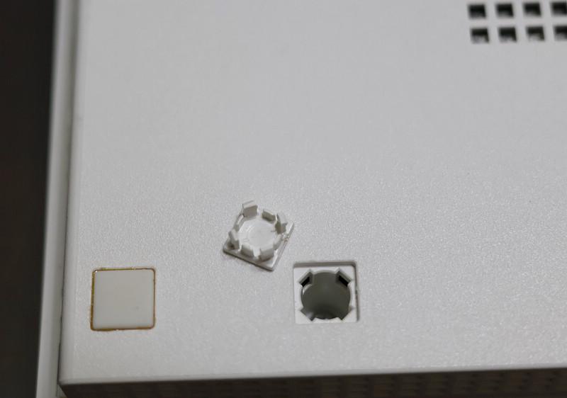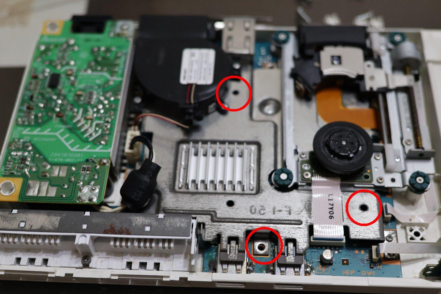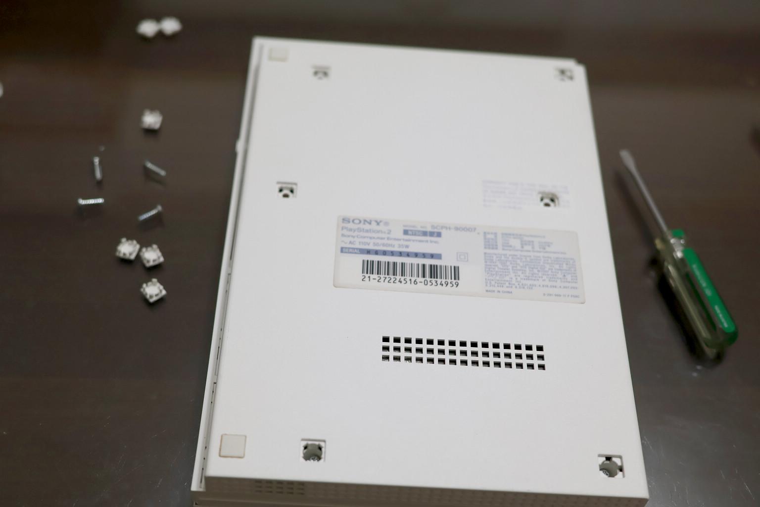 先拆卸PS2主機殼,要找出螺絲位置,在主機底部位置共六個地方(紅圈處),有兩個位置剛好就是主機腳墊,由於採用隱蔽式設計,需要先利用薄板或小一字起翹開這些塑膠片,才會看到這些螺絲
