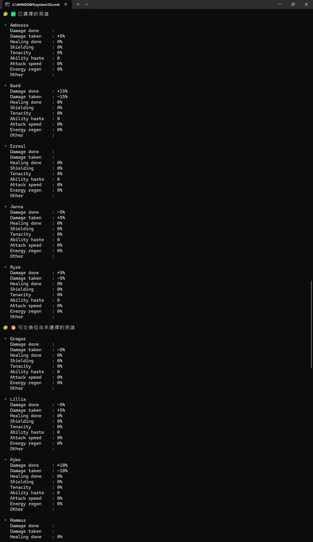 程式使用LCU API查詢自己和隊友所選擇的角色 然後從這個生成好的json文件裡去找出相應的英雄資料去顯示出來