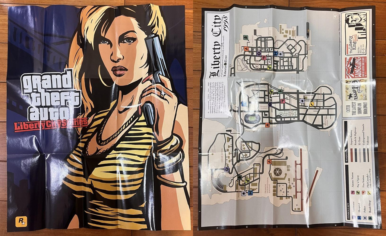 很喜歡這片 GTA 美式漫畫格的封面設計,說明書弄得像是城市導覽的刊物,還附了一張自由城地圖+豔女海報。