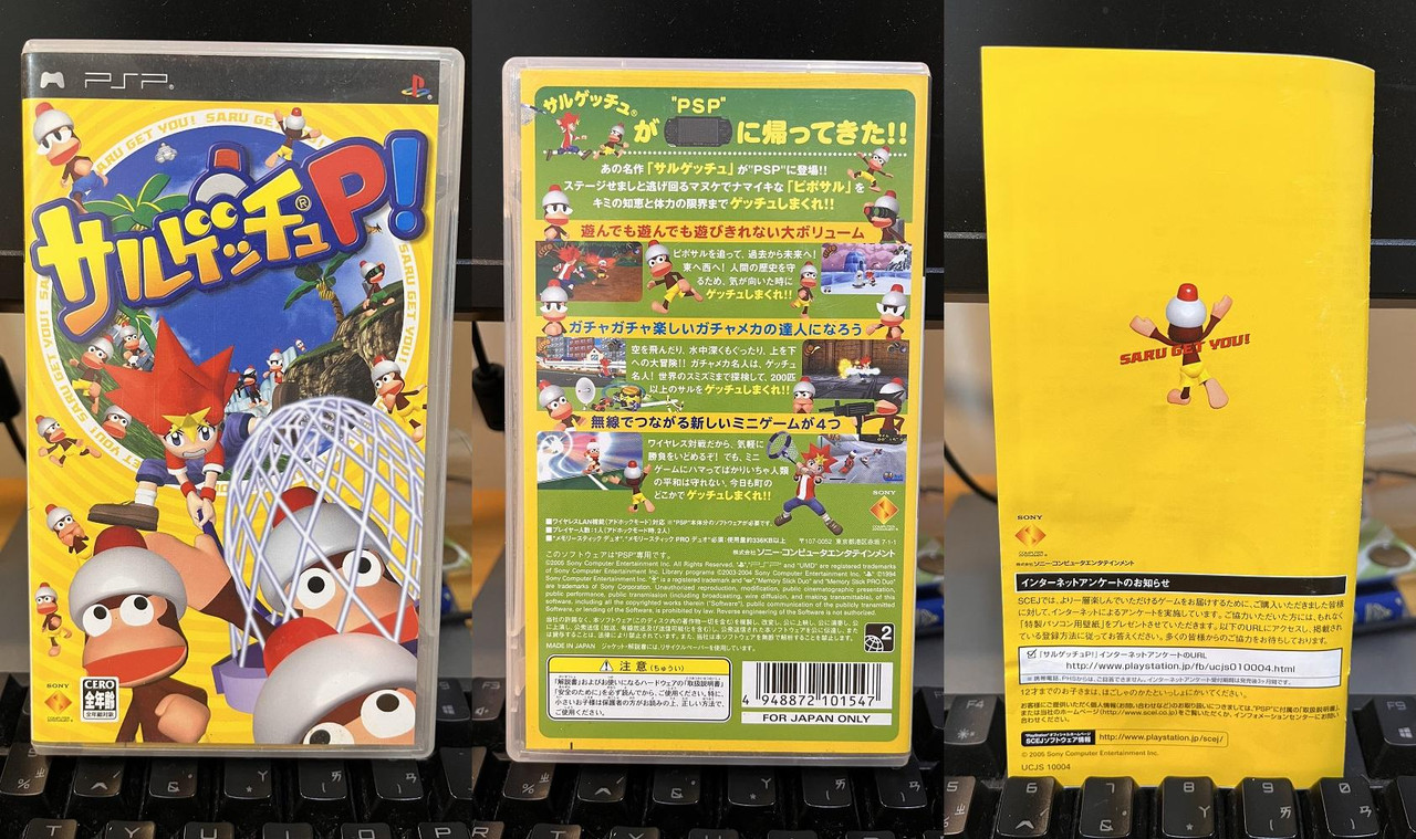 遊戲封面、封底、手冊皆充滿了玩味感;手冊背面一隻逃跑中的嗶波猴,印上 Saru(猴的日文) Get You! 的字眼,真是畫龍點睛的圖案設計。