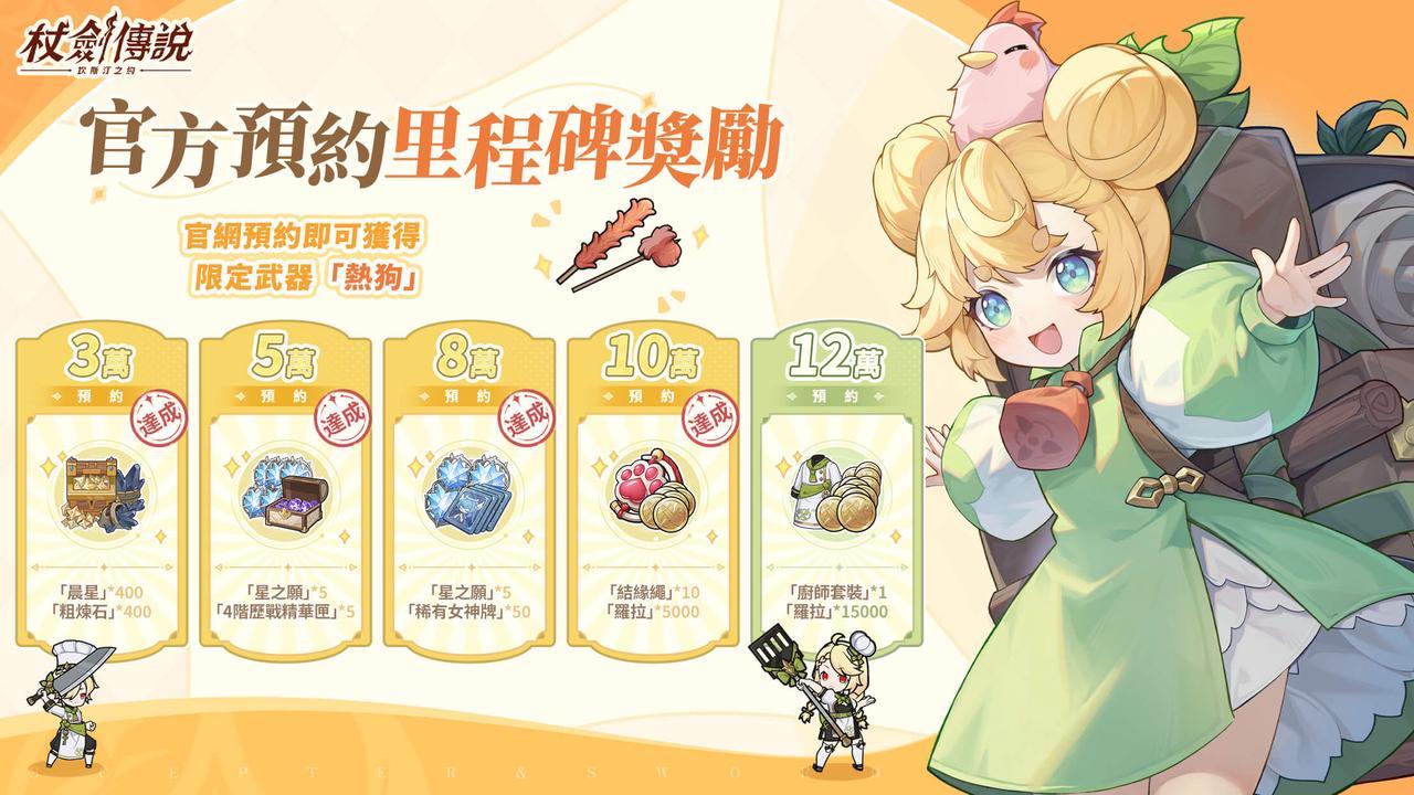 看到這張圖了嗎?這就是我們官方預約的里程碑獎勵!現在預約,上市後就能拿到*限定武器「熱狗」和超可愛的「廚師套裝」*等限量專屬好禮,真的是送好送滿、誠意十足!如果你也想跟我一樣,享受這種輕鬆又熱血的異世界冒險,那就趕快去預約《杖劍傳說》*吧!詳細預約連結與官方社群資訊,我都會放在影片與文章下方喔!