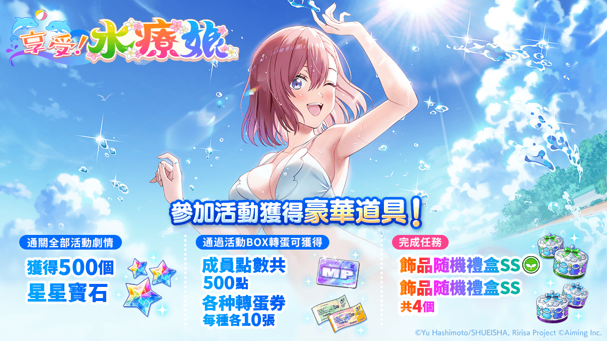 作為期間限定活動『享受!水療娘』活動限定季票「特殊季票」主打獎勵,分別可獲得 提升能力值限定稱號「『享受!水療娘』Special」、高級轉蛋券(免費)10 張、S 以上角色確定禮物 + 20 個、限定情境語音「天乃理理沙 - 海邊的游泳教室」。