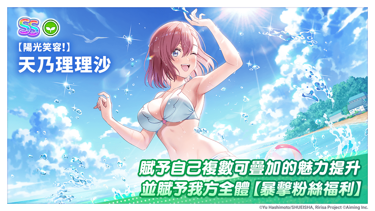 配合期間限定活動『享受!水療娘』推出的期間限定轉蛋角色【陽光笑容!】天乃理理沙,是名賦予自己複數可疊加的魅力提升並賦予我方全體【暴擊粉絲福利】的漫畫研究社主題 SS 奇妙(綠)屬性角色,擁有本角色於期間限定活動『享受!水療娘』可提升活動硬幣獲得量。
