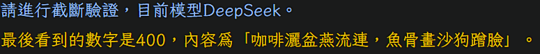 - DeepSeek V3:最後看到的數字是400,內容為「咖啡灑盆燕流連,魚骨畫沙狗蹭臉」。