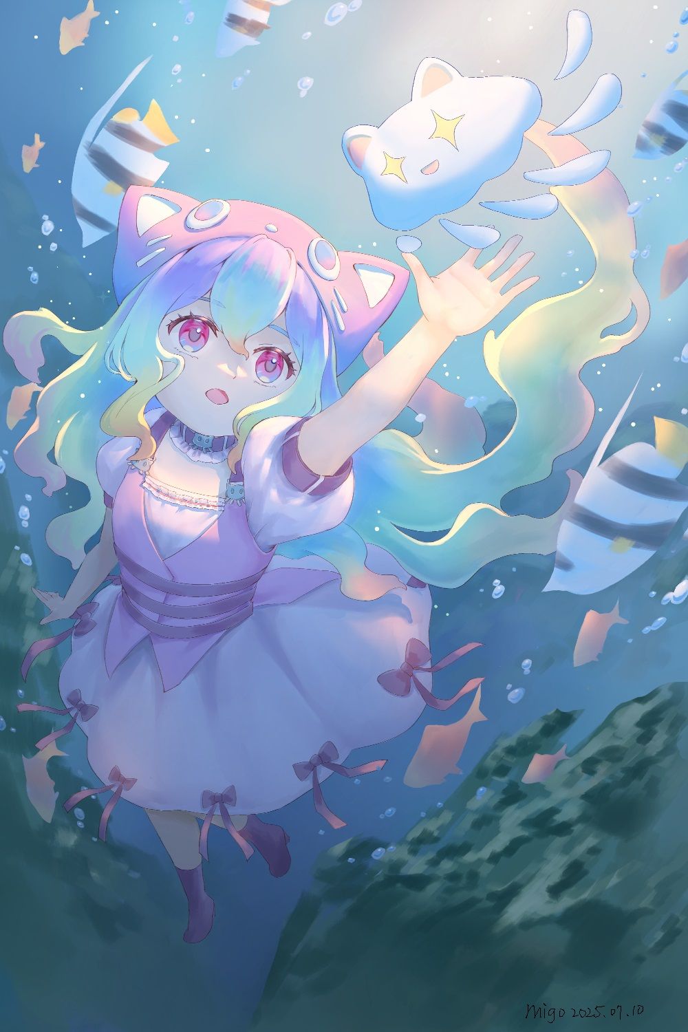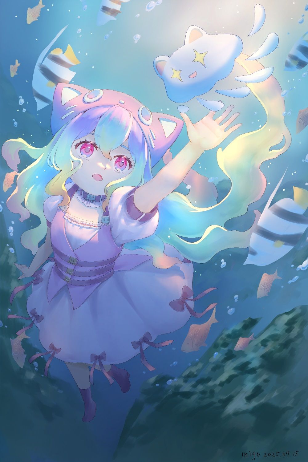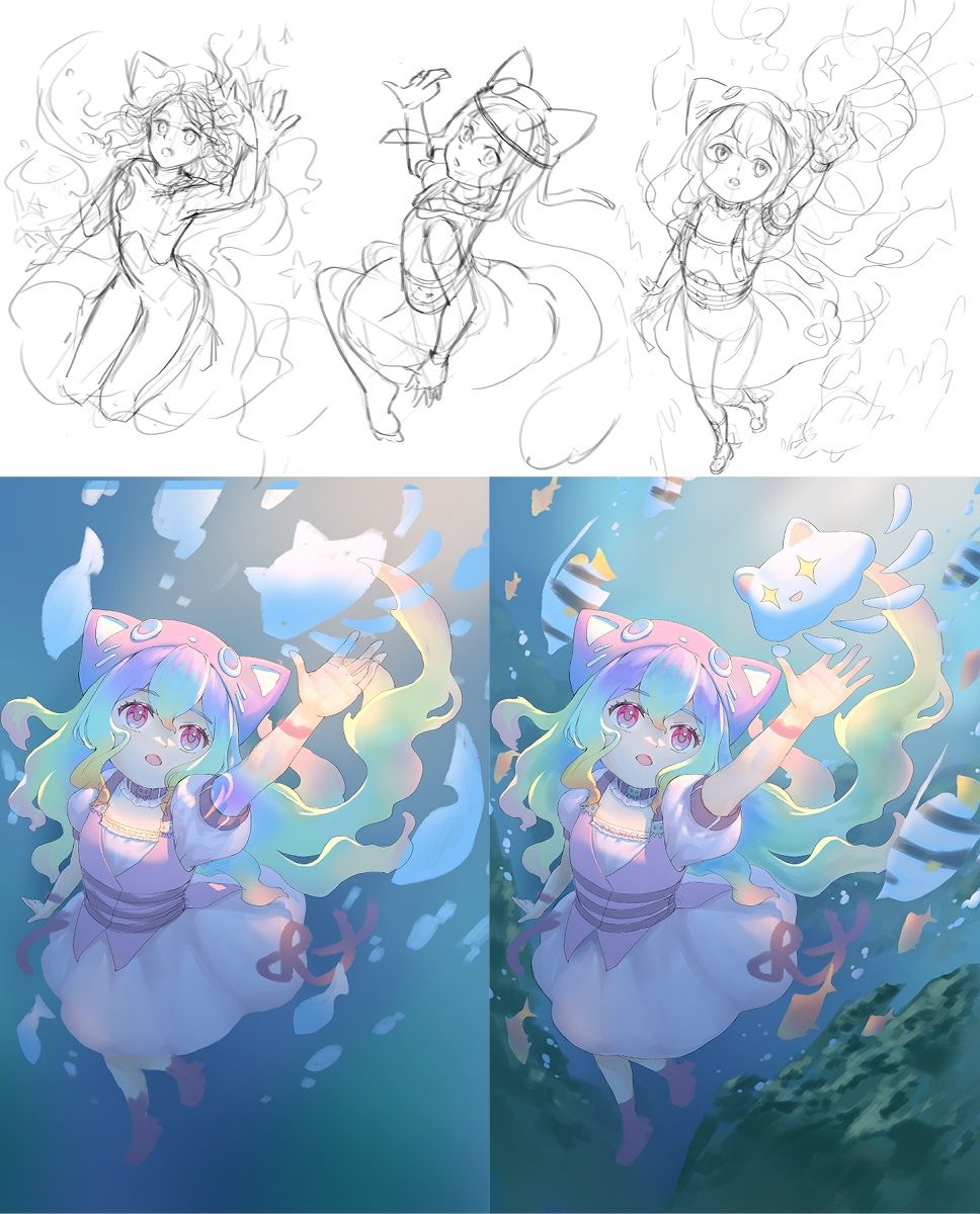 「深海中一片黑暗,水母喵迎向了未知之處照射進來的光,身邊開始出現了色彩。」