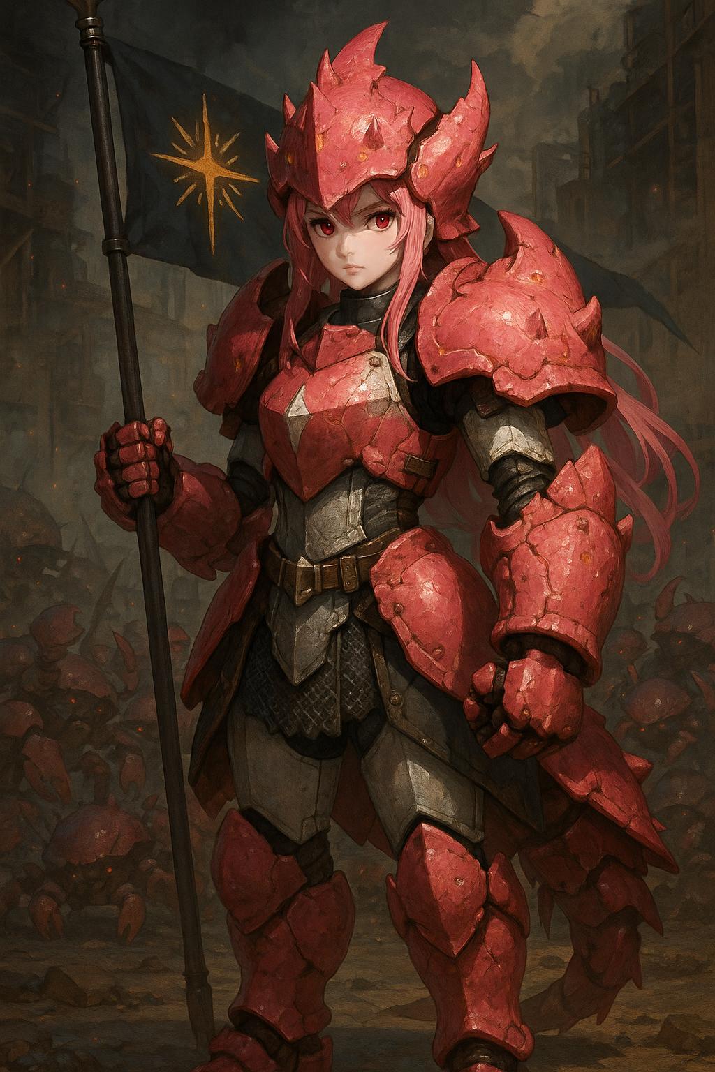 粉紅長髮、赤紅雙眼、仿造地球智人少女體態,身穿銀白護鎧,手持戰旗槍,是全場唯一一位非甲殼類的神兵。