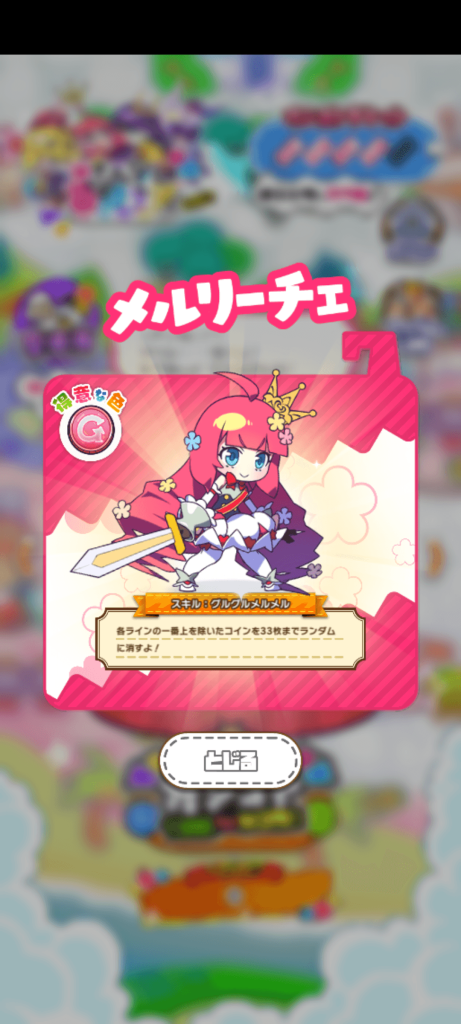另一個需要鑽研的部分則是關於角色技能的使用,因為角色間技能的差異性頗大,所以在玩不同角色的時候,就需要用完全不同的思維跟戰術來擺放硬幣。像「三日月」的技能可以一口氣消除中排的硬幣,因此玩三日月的時候就可以盡量把廢幣丟在中間;而「メルリーチェ」可以隨機消除盤面上最多33個硬幣,就很適合用來緊急解場。
