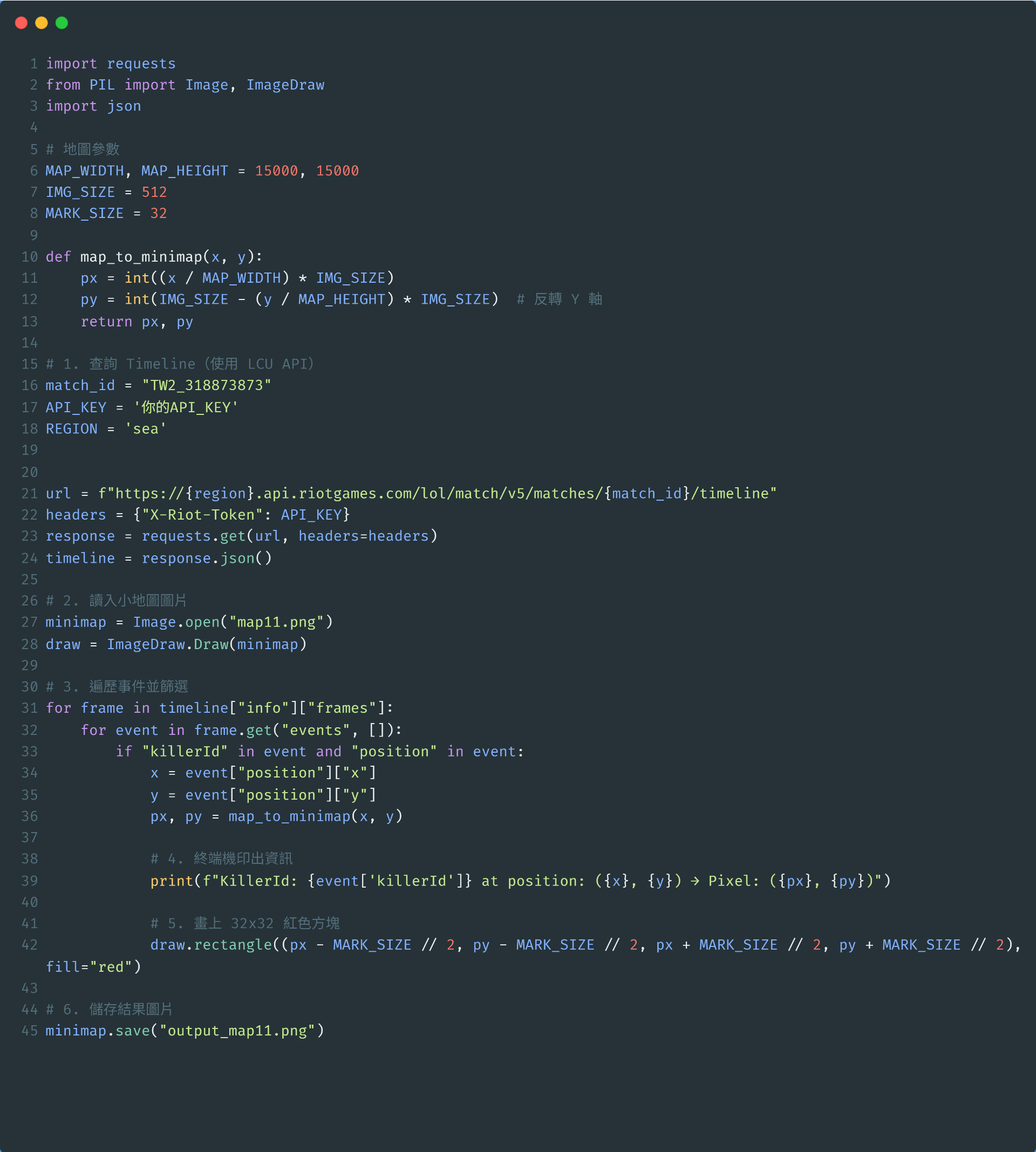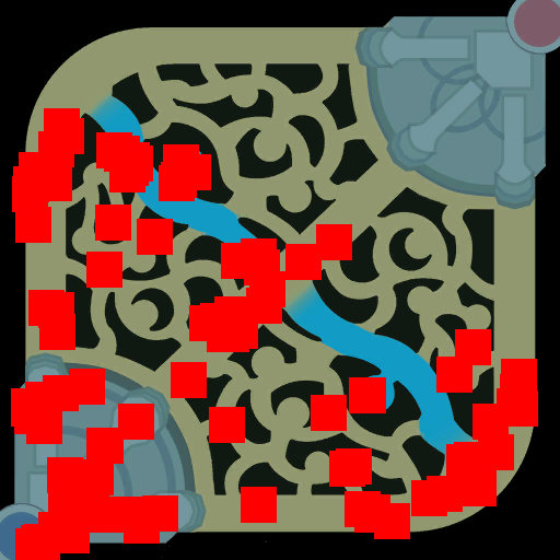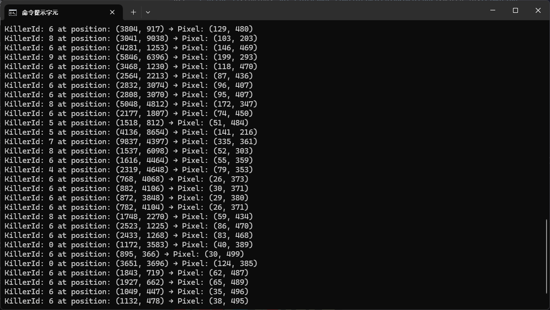 座標轉換計算方法用的是比例映射方式15000x15000(X/Y pos) --> 512x512(Pexels) 看起來精度可能還需要再調整 明顯有守衛跑到地圖邊界外去了