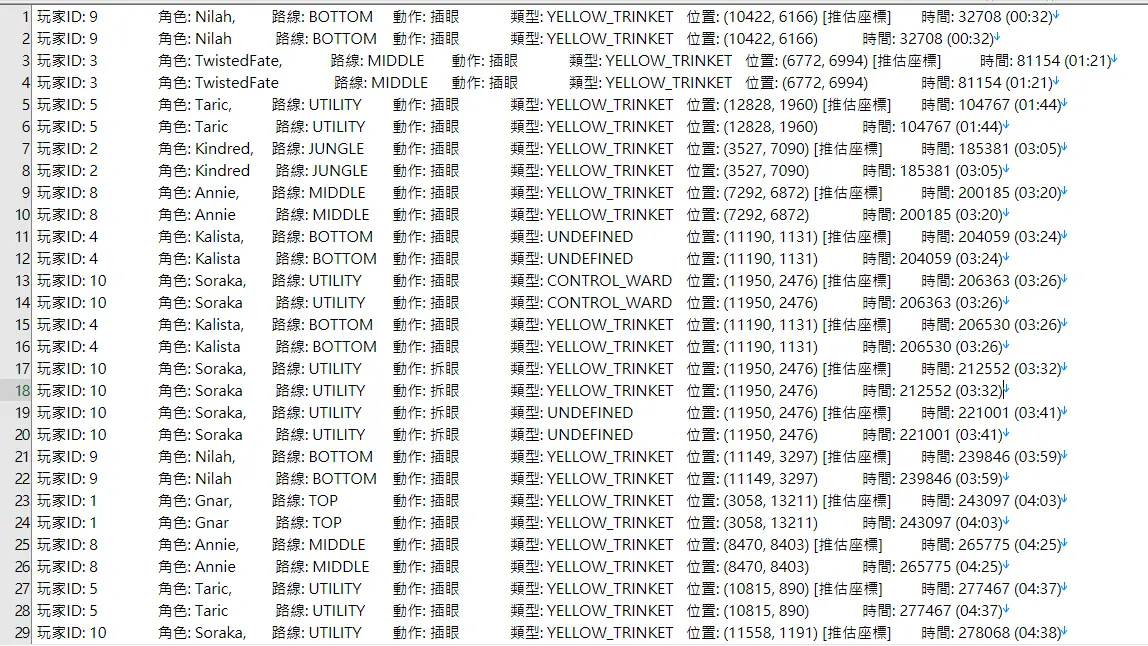 • wardType: 插眼類型(如 YELLOW_TRINKET, CONTROL_WARD)