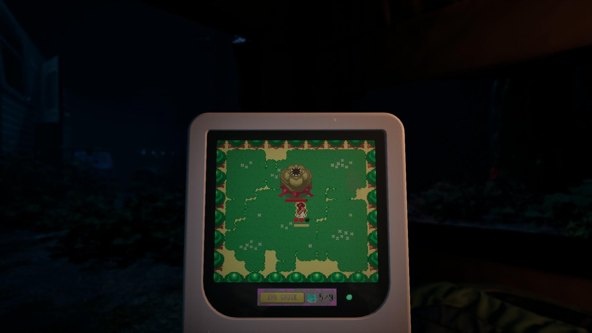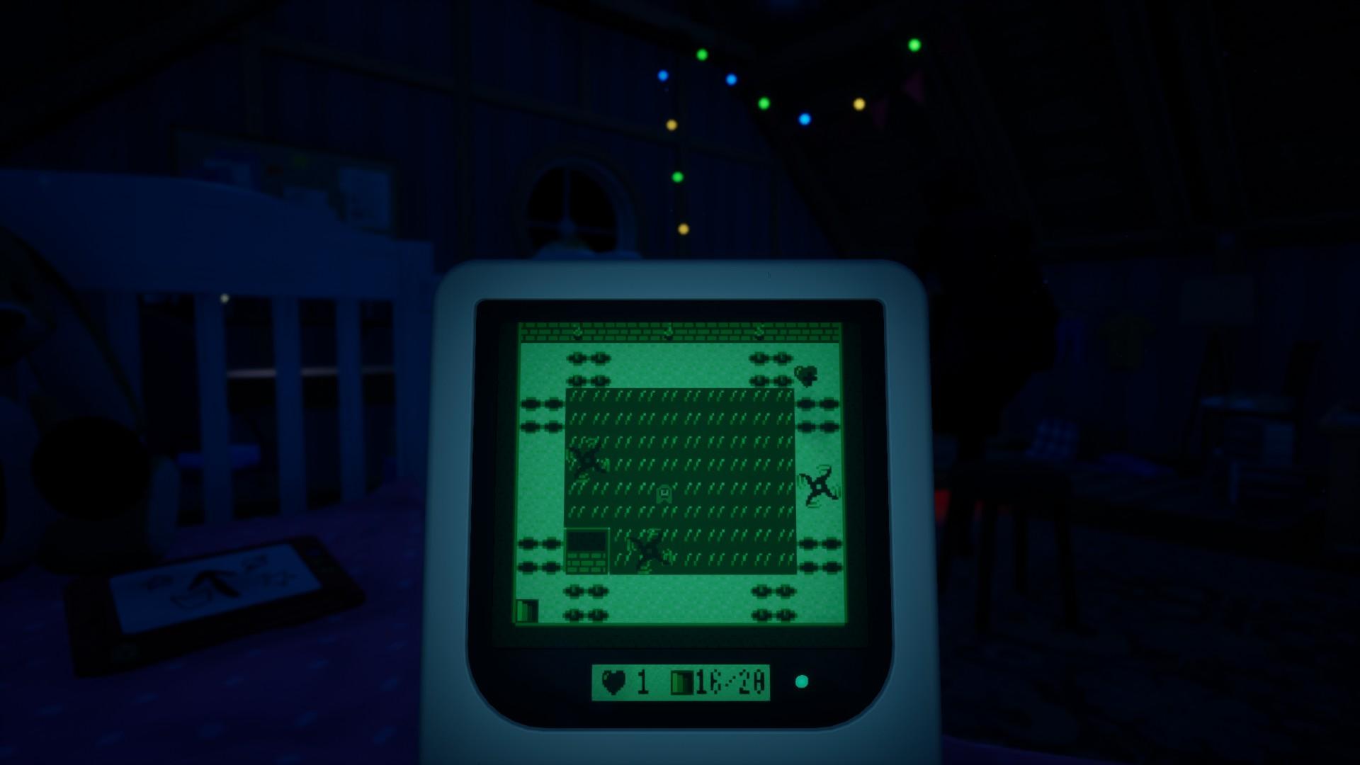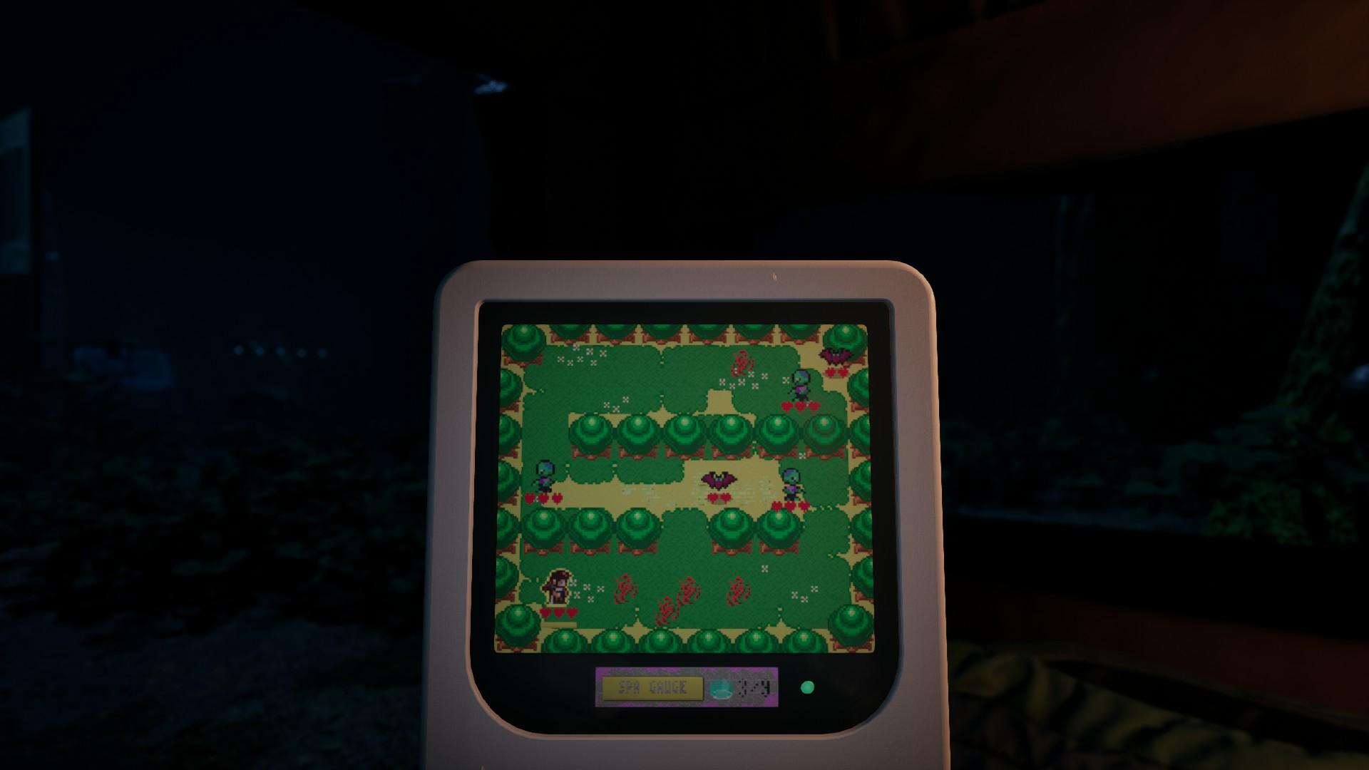 最後第三個關卡的遊戲叫做Dawn of Knightmare,簡單來說就是早期會在紅白機上面玩到覺得比較高級的王子拯救公主的遊戲(結果我直接拿最終幻想早期的台灣翻譯公主蒙難記來說XD)。這一款操作起來就比較複雜,我們扮演的王子一開始可以拿劍或者弓,我個人是使用劍,這邊總共是九個關卡,而遊戲地圖就又更開放了,我們直接紮營在外面的帳篷裡,媽媽會在叢林裡或者露營車上隨時看著你。這一關我自己體趕上比較沒有分階段,因為真的是開放式空間,基本上好像幾乎都是比較隨機的,但我不確定是不是製作團隊也有刻意設計,這一關的判定,體感上比較寬鬆一點,有幾次我發現我的身後有紅光(媽媽看過來)我才躲起來,系統也沒有判定失敗。總之這一關我個人覺得很看運氣,而且本關卡媽媽的機動性超高,她會直接用爬行的方式到處暴衝,偶爾還會突然整個人撲上帳篷,我覺得這個部分是偏向獵奇,並沒有那種恐怖遊戲的壓迫感。