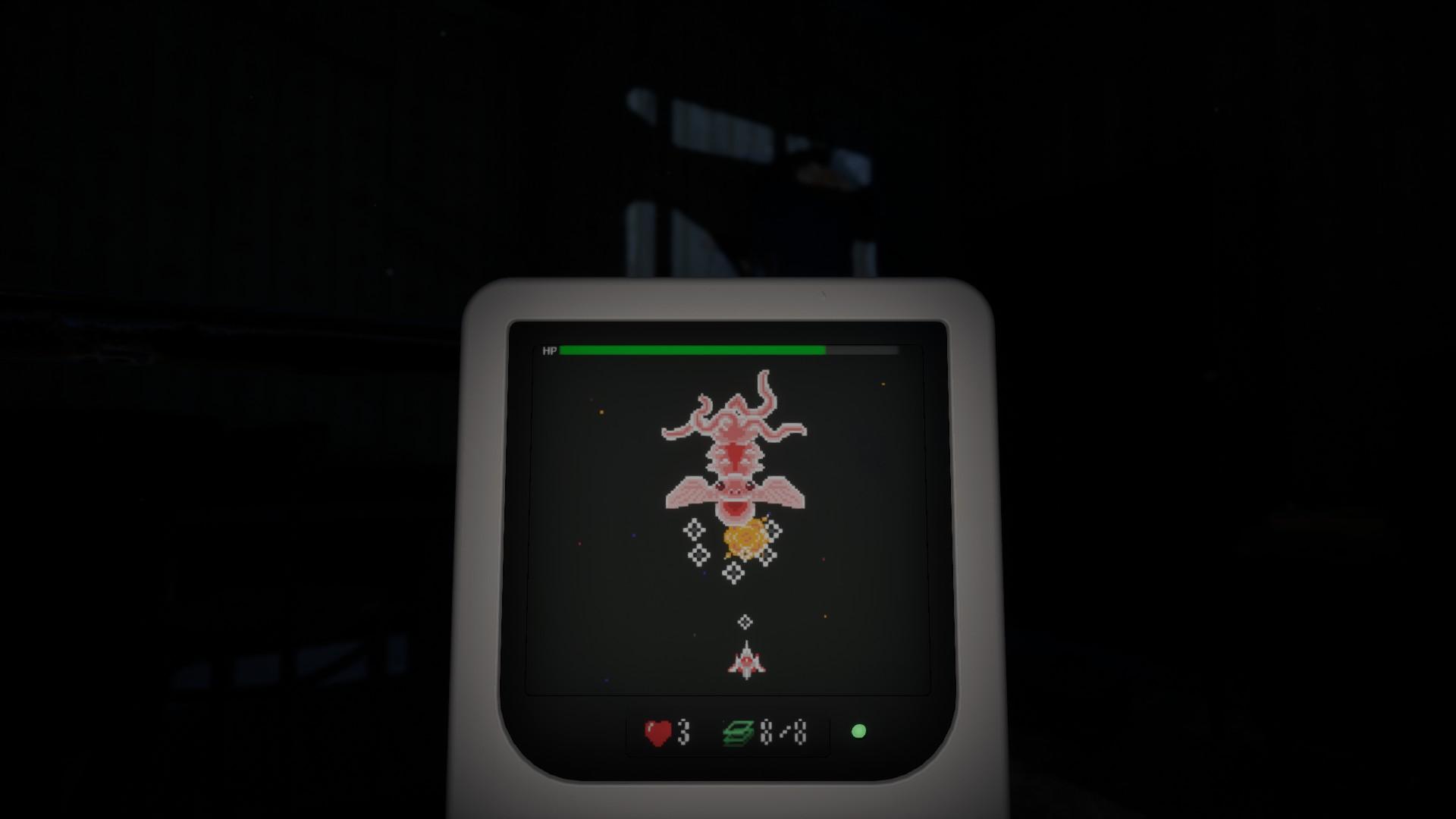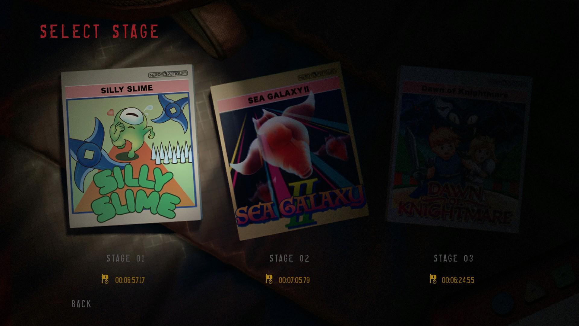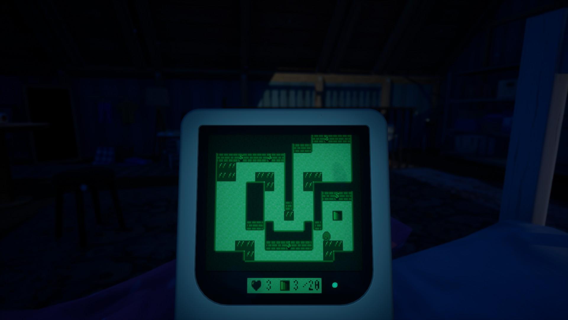 最後第三個關卡的遊戲叫做Dawn of Knightmare,簡單來說就是早期會在紅白機上面玩到覺得比較高級的王子拯救公主的遊戲(結果我直接拿最終幻想早期的台灣翻譯公主蒙難記來說XD)。這一款操作起來就比較複雜,我們扮演的王子一開始可以拿劍或者弓,我個人是使用劍,這邊總共是九個關卡,而遊戲地圖就又更開放了,我們直接紮營在外面的帳篷裡,媽媽會在叢林裡或者露營車上隨時看著你。這一關我自己體趕上比較沒有分階段,因為真的是開放式空間,基本上好像幾乎都是比較隨機的,但我不確定是不是製作團隊也有刻意設計,這一關的判定,體感上比較寬鬆一點,有幾次我發現我的身後有紅光(媽媽看過來)我才躲起來,系統也沒有判定失敗。總之這一關我個人覺得很看運氣,而且本關卡媽媽的機動性超高,她會直接用爬行的方式到處暴衝,偶爾還會突然整個人撲上帳篷,我覺得這個部分是偏向獵奇,並沒有那種恐怖遊戲的壓迫感。
