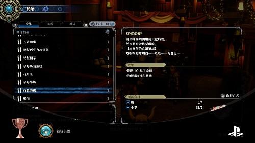 很麻煩的收集要素,共93種料理,照下面攻略網址,先拿到配方,之後每道料理都要做出來,要派遣任務去拿到素材,讓「內爾」支援,背包到90個,前面連續13個作出來後,這已確定拿到,剩下80個方便對照是否有1個在身上。注意食物素材有上限2000個,滿了就不能獲得,要去賣掉,這樣派遣任務才不會做白工。注意剩一個時紀錄,作為觸發PS5版獎盃用。