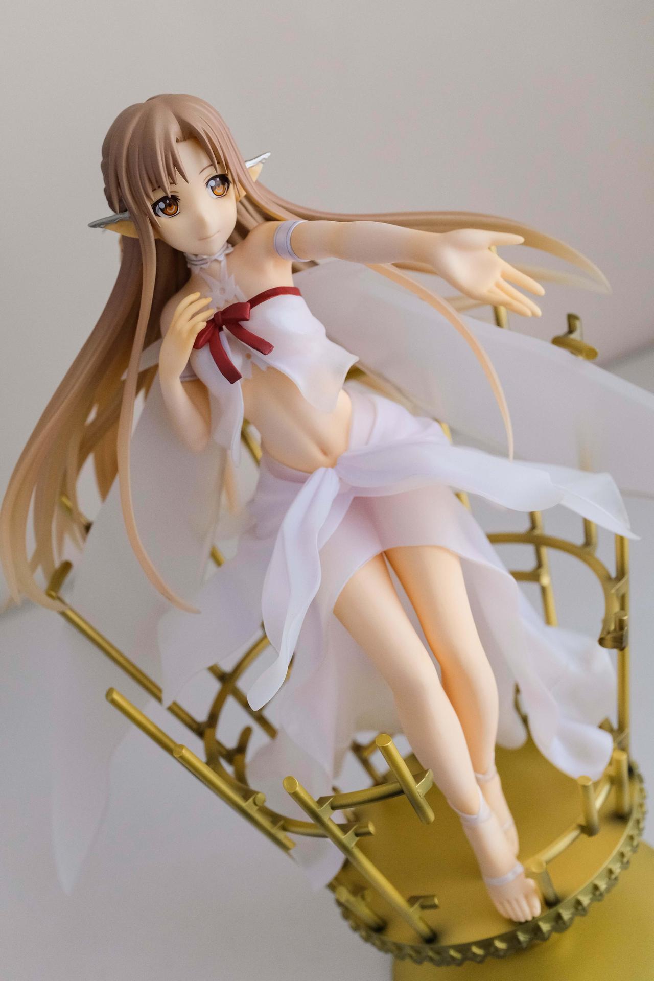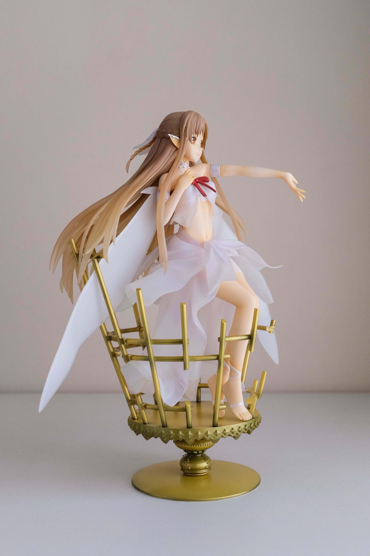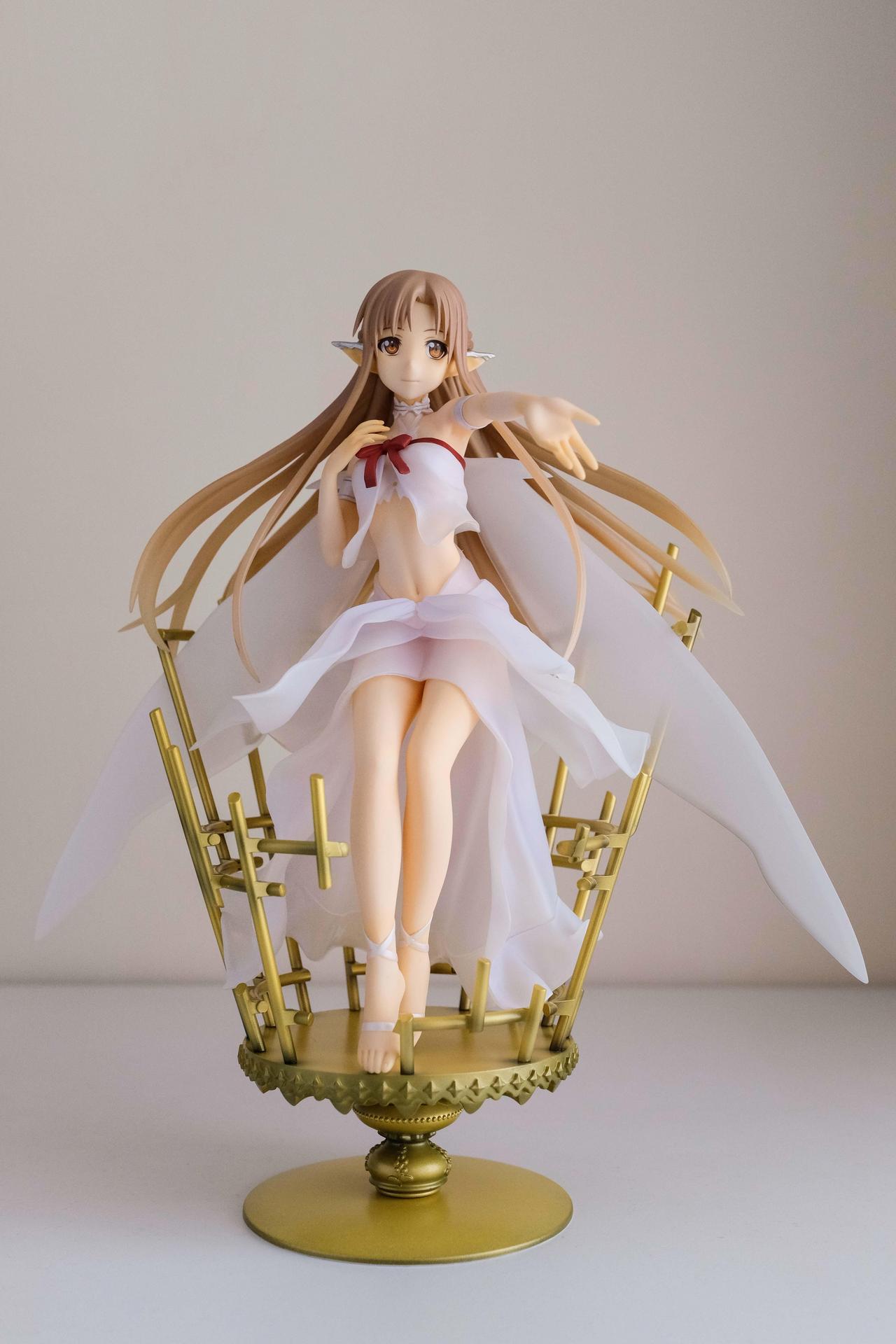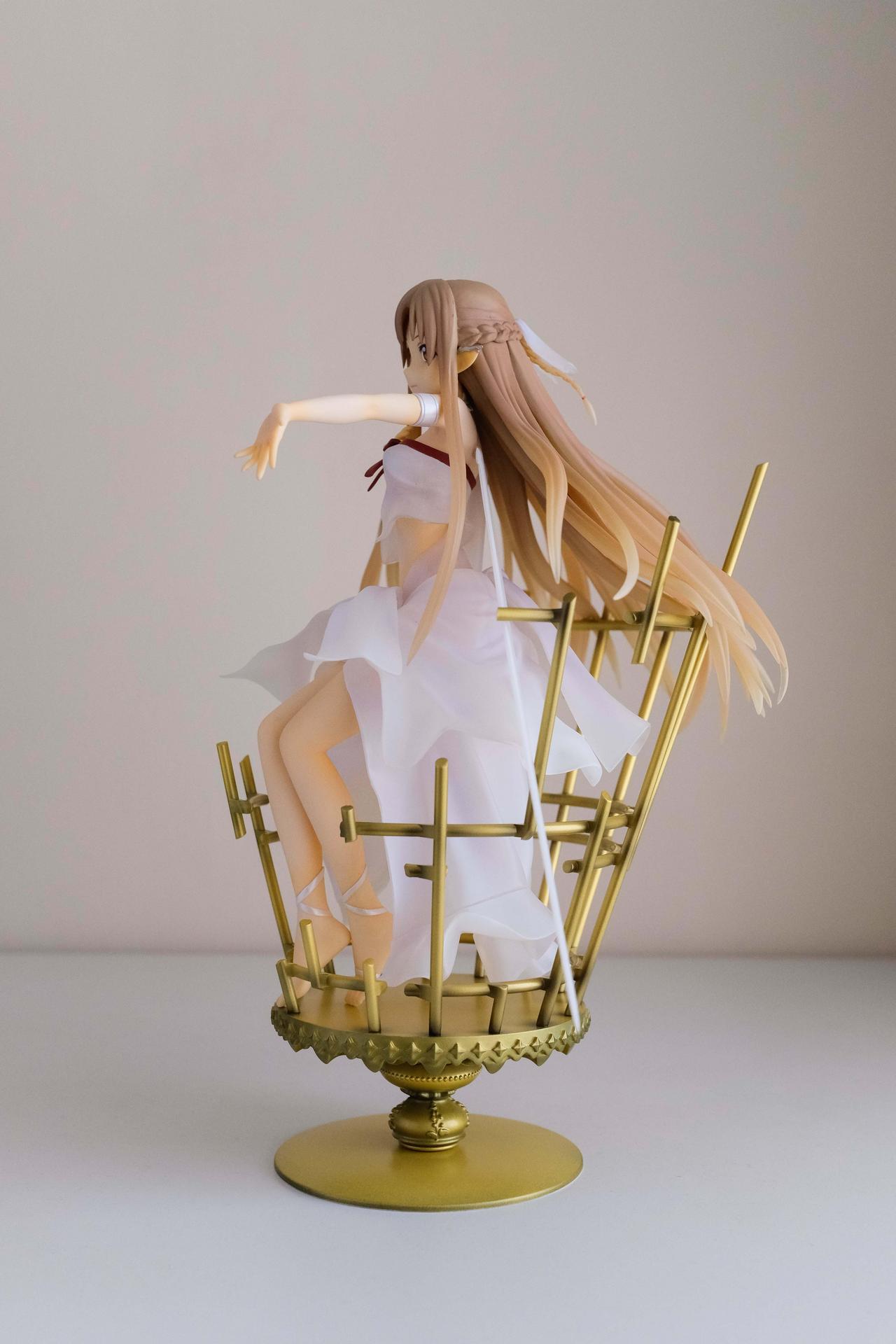 再來說亞絲娜,面相比較普通,只有在特定角度下比較好看(或是說比較自然?),值得一提的是,無論是衣服或是漸層半透明的翅膀部分,在經過長時間的存放,仍完全沒有變黃,這點非常加分。至於底座部分,金屬的質感普通,不如莉法的底座精緻。整體來說,除非你像我一樣,一定要收藏一隻舊ALO篇的亞絲娜的話再買,否則亞絲娜的PVC仍有更多更好的選擇