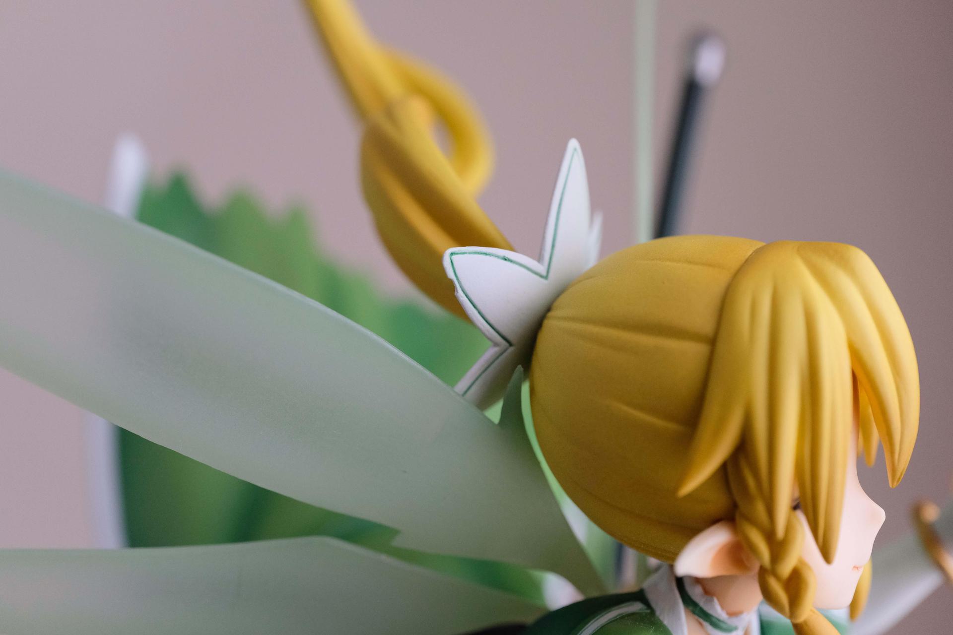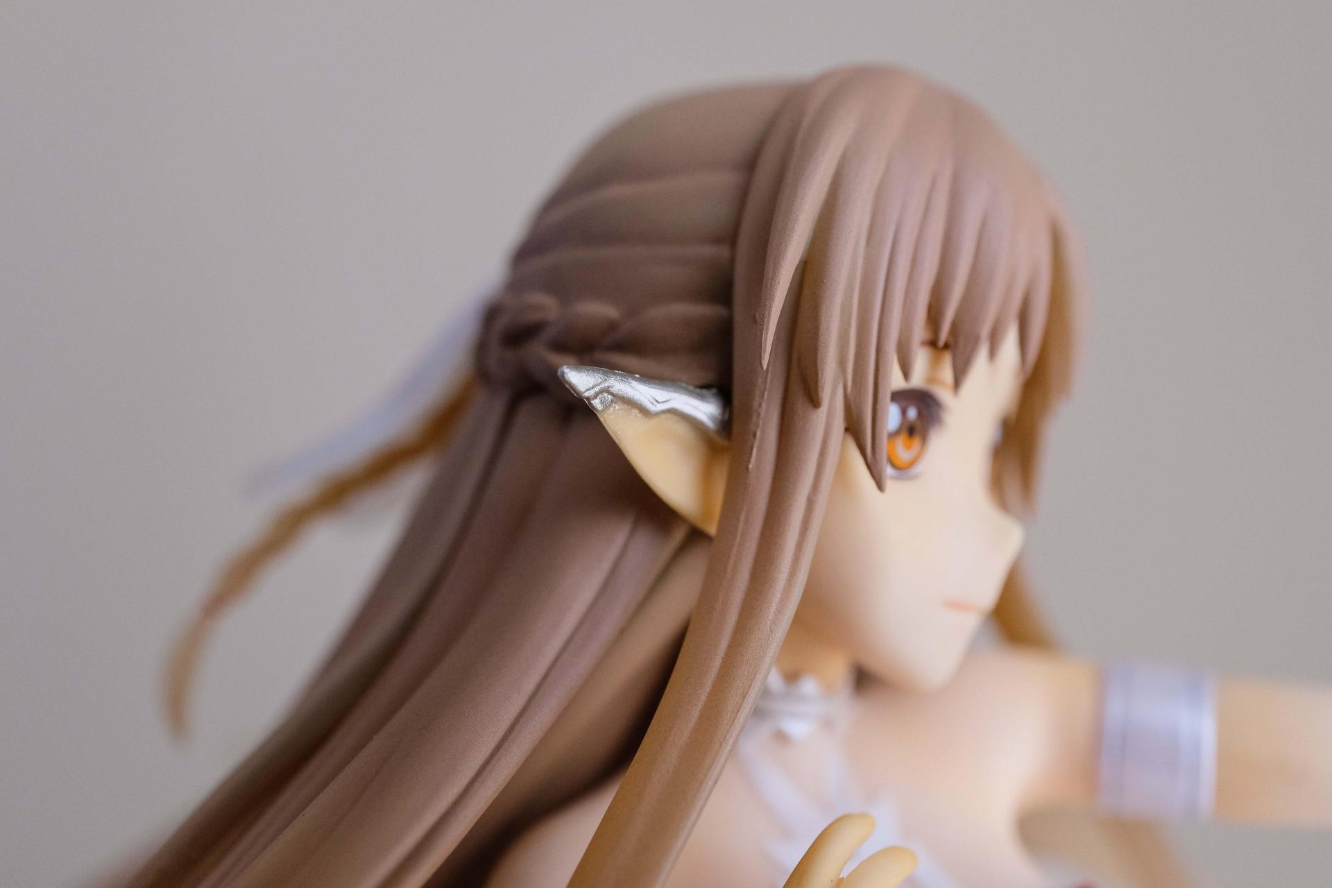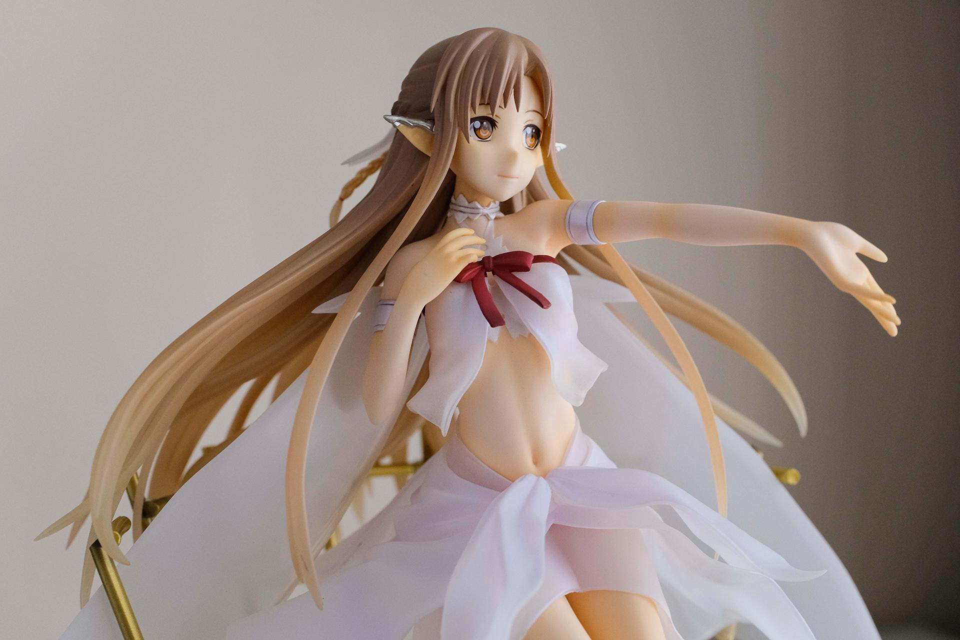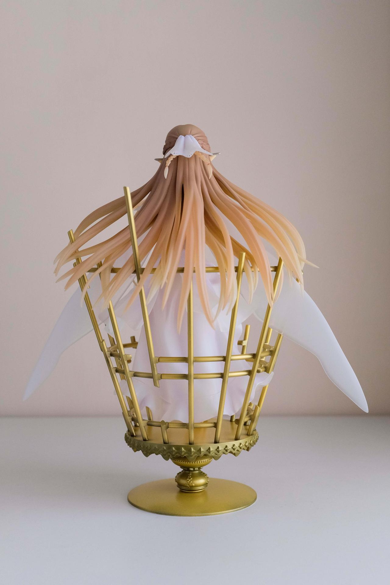 再來說亞絲娜,面相比較普通,只有在特定角度下比較好看(或是說比較自然?),值得一提的是,無論是衣服或是漸層半透明的翅膀部分,在經過長時間的存放,仍完全沒有變黃,這點非常加分。至於底座部分,金屬的質感普通,不如莉法的底座精緻。整體來說,除非你像我一樣,一定要收藏一隻舊ALO篇的亞絲娜的話再買,否則亞絲娜的PVC仍有更多更好的選擇