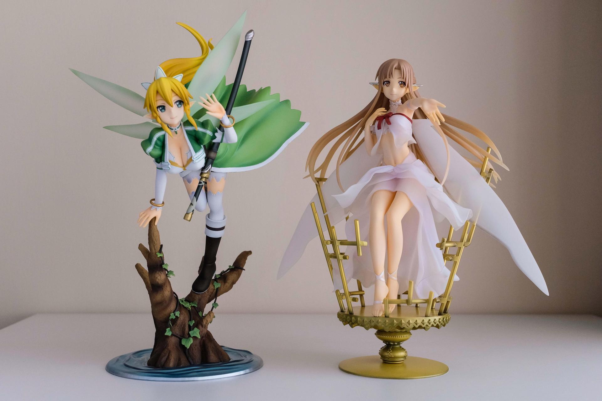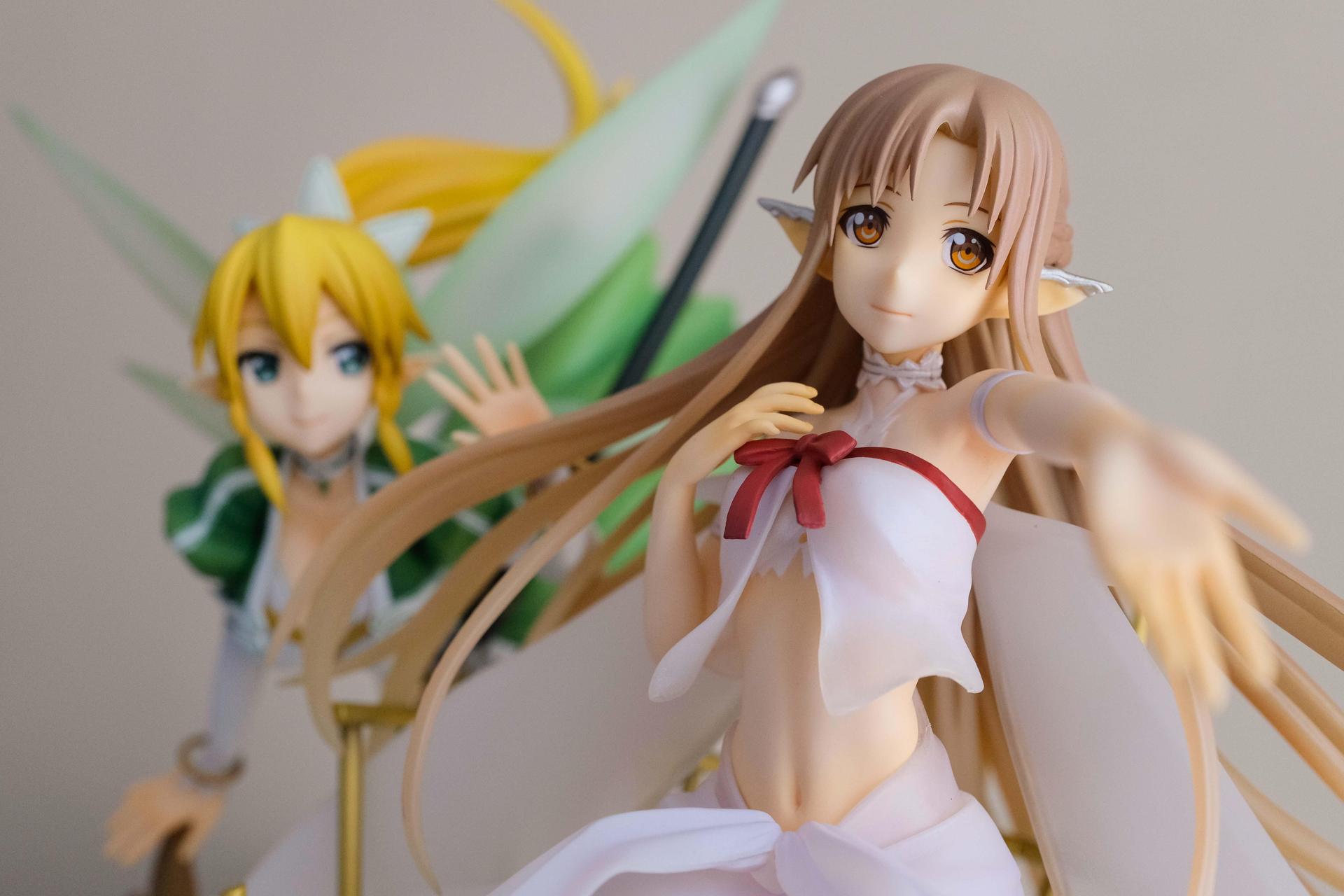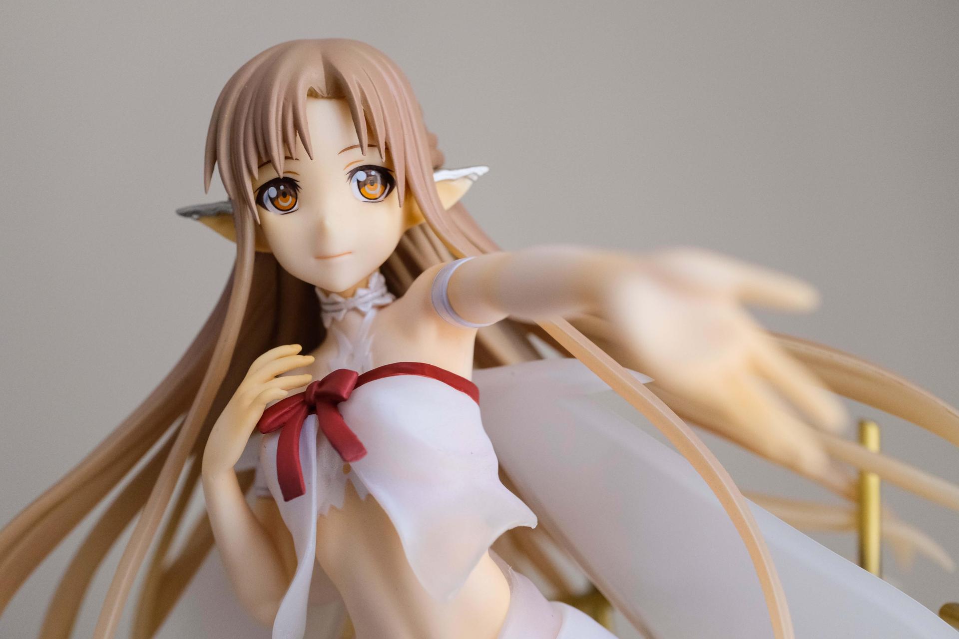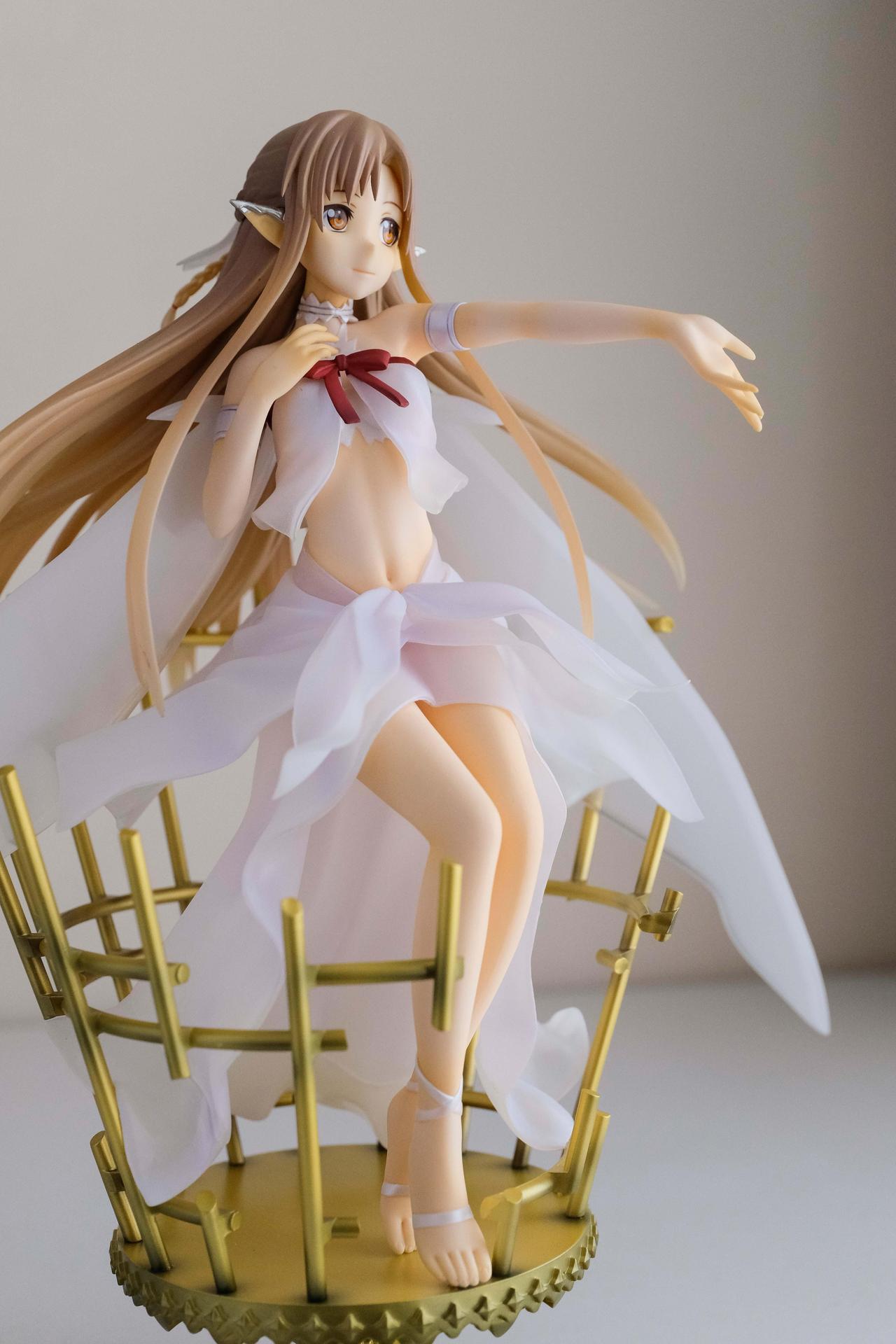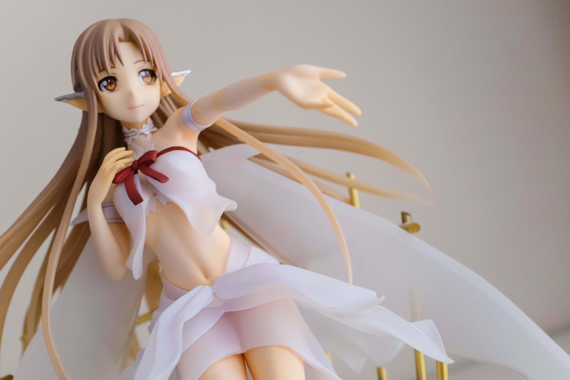 再來說亞絲娜,面相比較普通,只有在特定角度下比較好看(或是說比較自然?),值得一提的是,無論是衣服或是漸層半透明的翅膀部分,在經過長時間的存放,仍完全沒有變黃,這點非常加分。至於底座部分,金屬的質感普通,不如莉法的底座精緻。整體來說,除非你像我一樣,一定要收藏一隻舊ALO篇的亞絲娜的話再買,否則亞絲娜的PVC仍有更多更好的選擇
