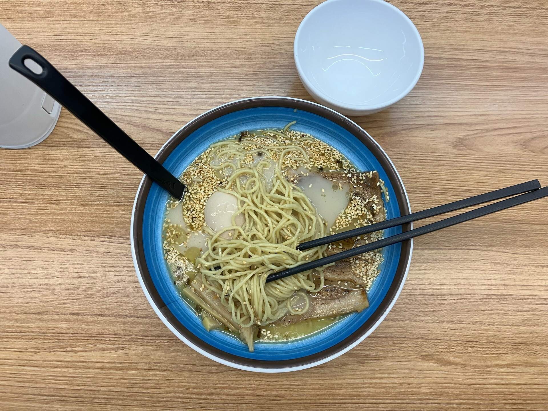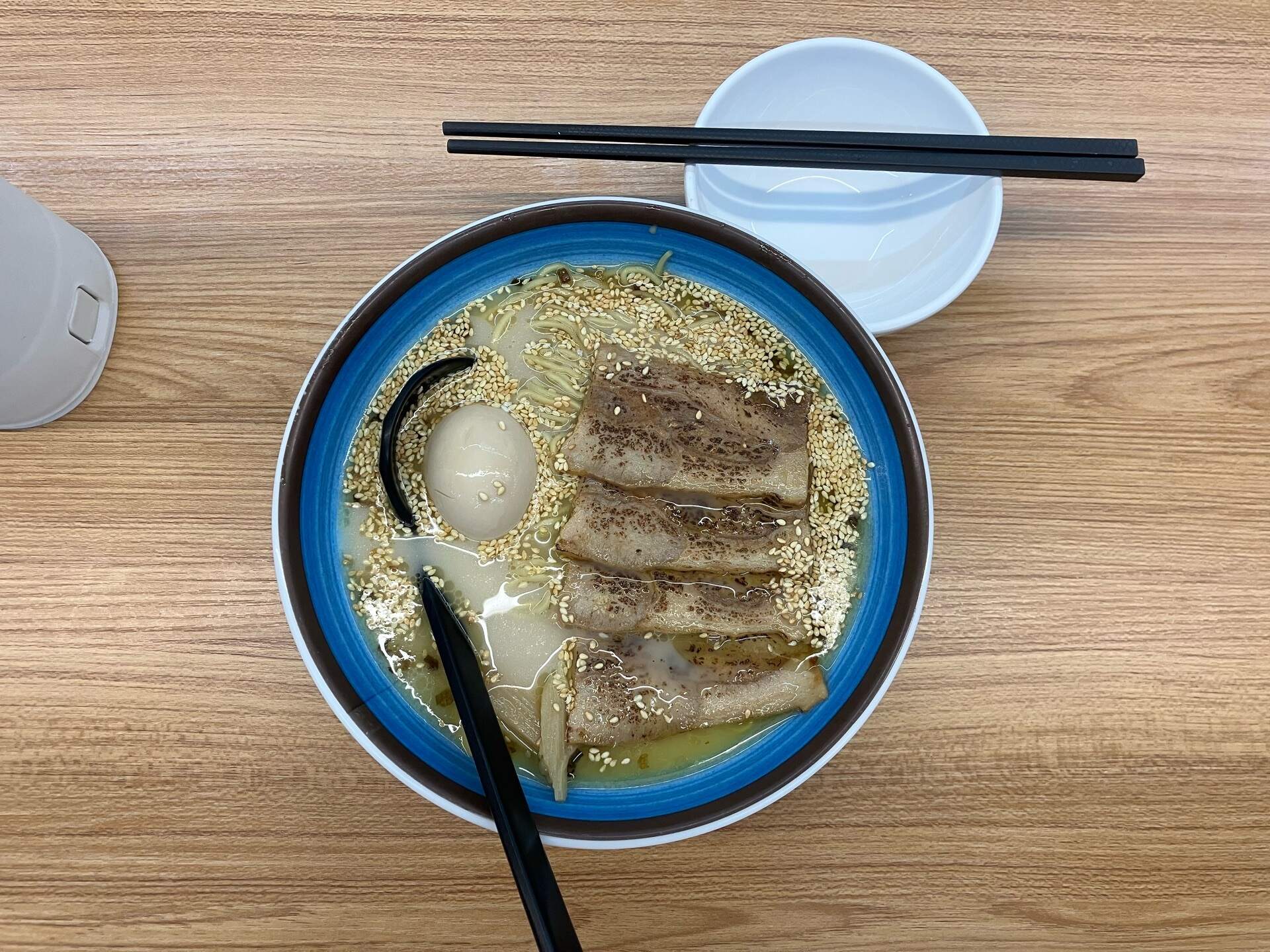 我點了一碗芝麻叉燒拉麵,本來還會再加上蔥花,後來客製成沒有蔥花的拉麵,因為以前在日本也這樣吃呢。(在日本吃拉麵,都不加蔥花。)