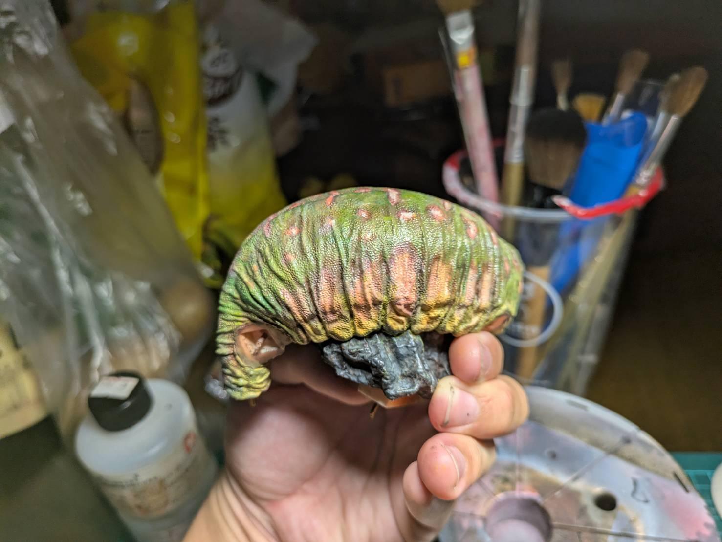 大致上用油性漆鋪色,粉斑個人覺得比較難呈現,所以先處理斑紋後續再疊色至體色成綠色。