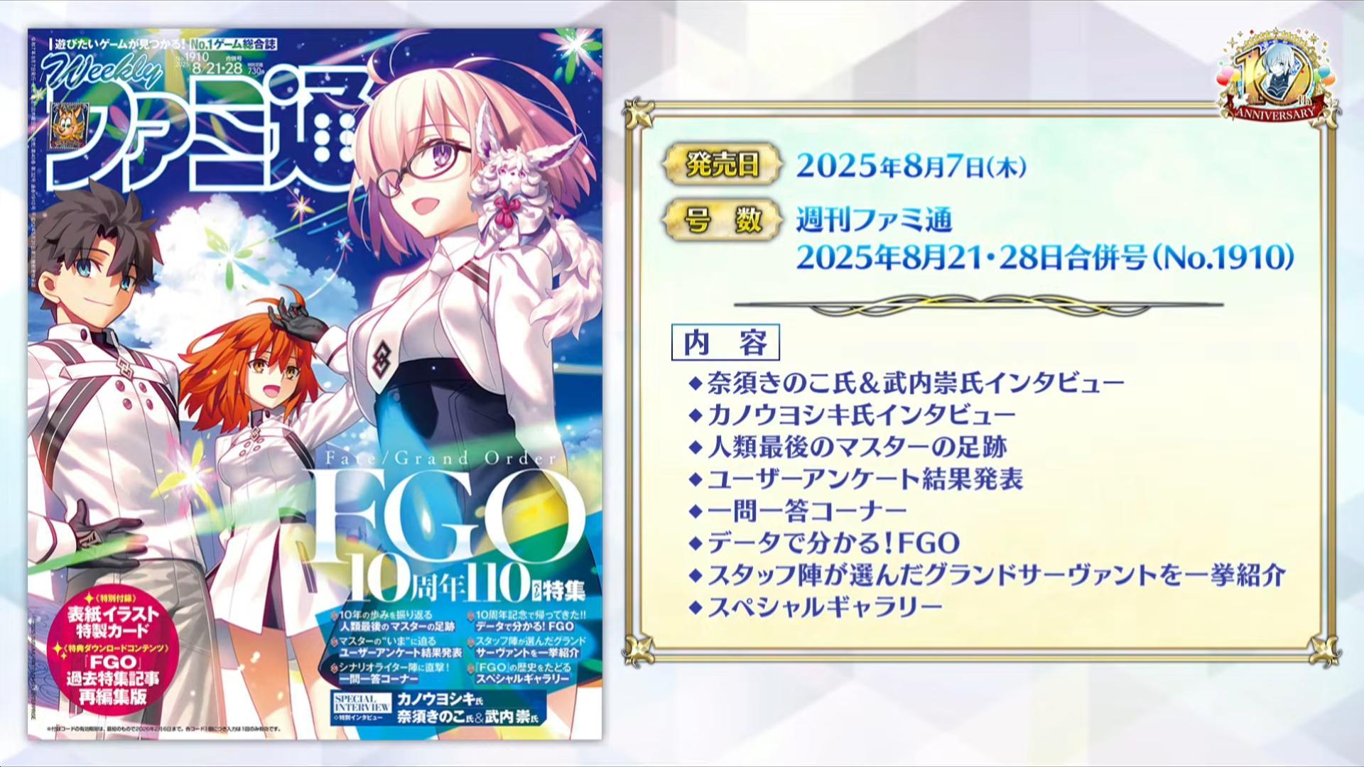 預定在 8 月 7 日發售的「週刊 Fami 通 2025 年 8 月 21.28 日合併號(No.1910)」揭曉封面插圖,當中收錄關於《Fate/Grand Order》日版 10 週年相關訪談等資訊,