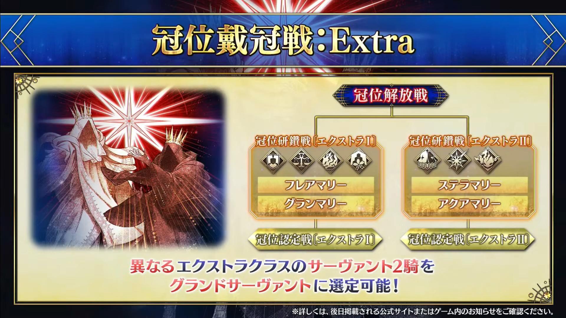 預定自 8 月 6 日起舉辦「冠位戴冠戰 Extra」,能夠分別為 Extra 1、Extra 2 選定冠位從者,特別在「Beast 職階」的部分透過突破所有奧爾嘉瑪麗關卡獲得的「U 硬幣」即可將「Beast/Unbeast」選定為冠位從者,同時於 Extra 任務追加常駐任務,而「冠位戴冠戰 Extra」將以兩時段開放無須消費 Storm Pod。