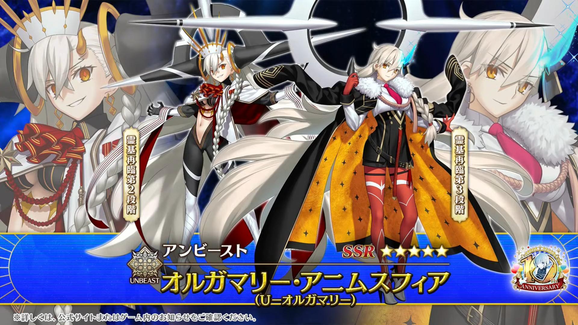 官方表示,作為《Fate/Grand Order》日版 10 週年全新從者揭曉為「★5(SSR)U-奧爾嘉瑪麗(Unbeast)」,靈基再臨第二階段為「U-奧爾嘉瑪麗」、靈基再臨第三階段則會變換為「奧爾嘉瑪麗‧亞寧姆史菲亞」,玩家可先行在體驗關卡體驗角色的魅力並獲得「呼符 1 張」。