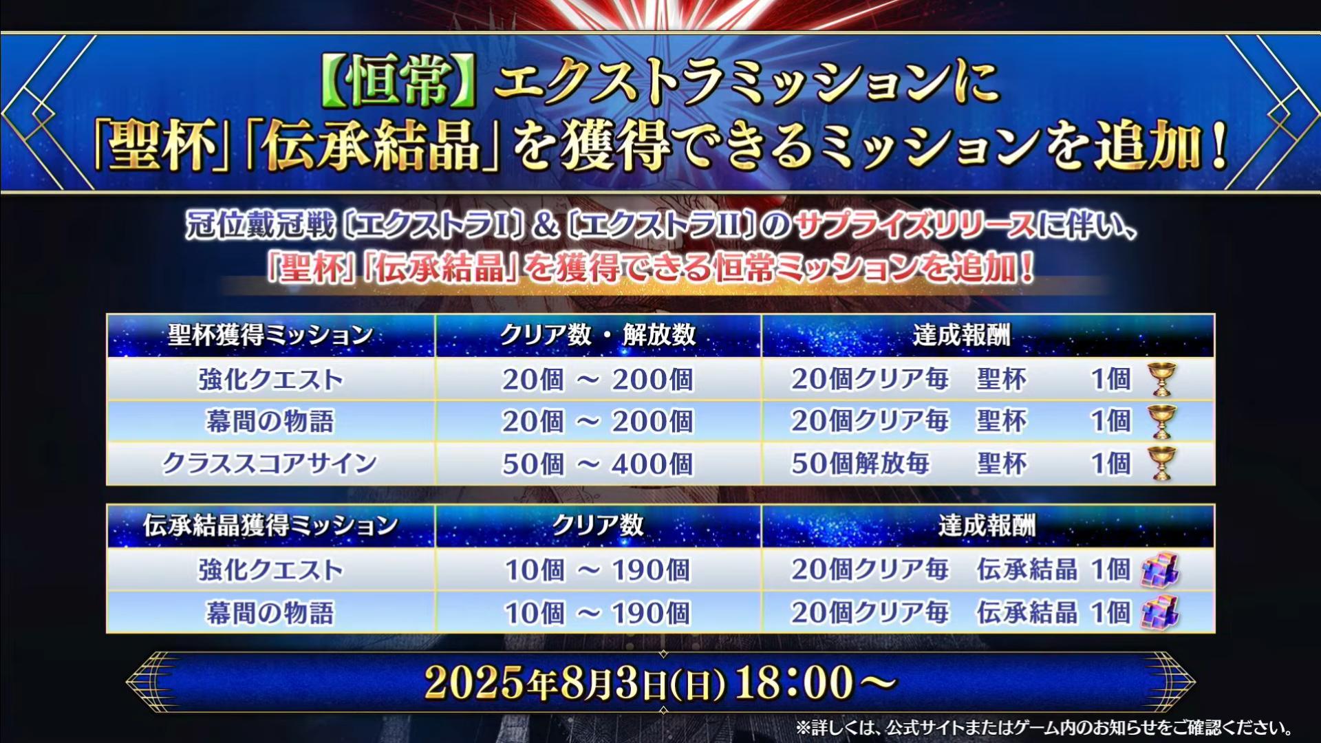預定在 2025 年冬季開幕「第 2 部 終章」正式決定將在 12 月 20 日開幕,需通過「奏章 Ⅳ」才可參加,同時期間內 8 月 3 日~12 月 20 日通過「奏章 Ⅳ」即可獲得「聖晶石 1000 個」,領取期限則至 12 月 27 日為止。