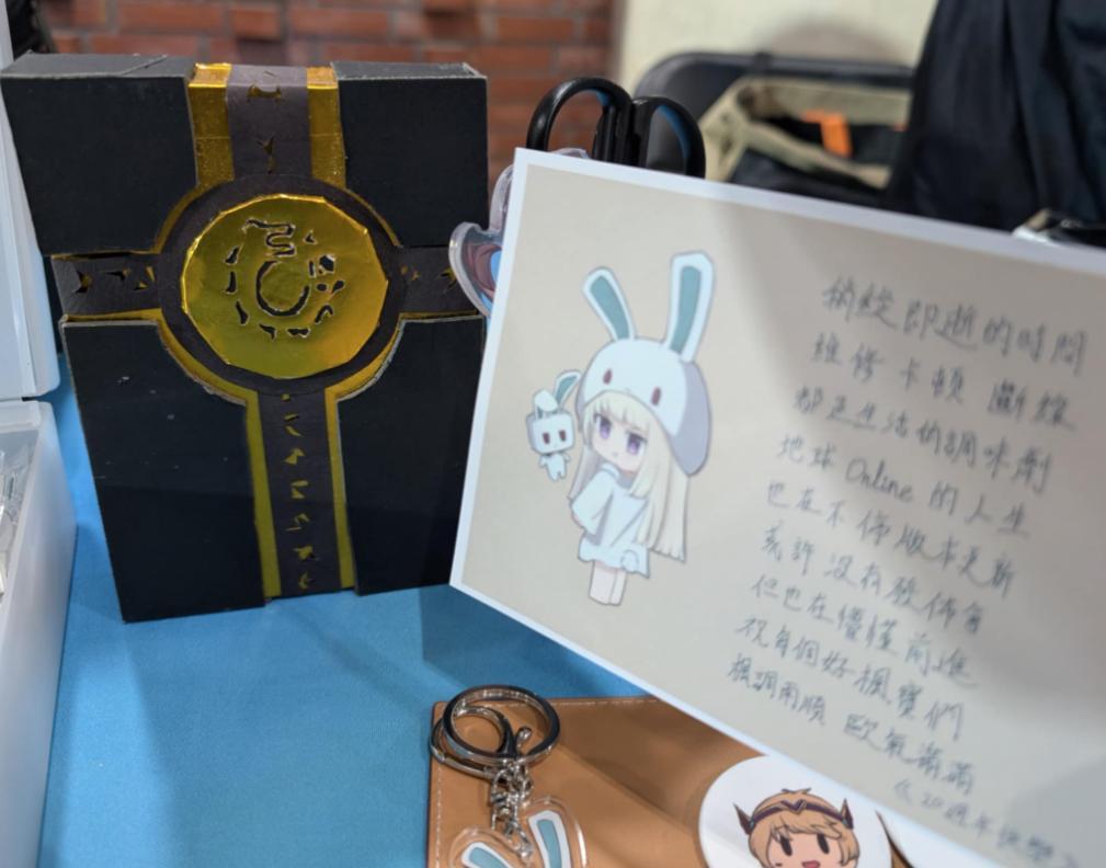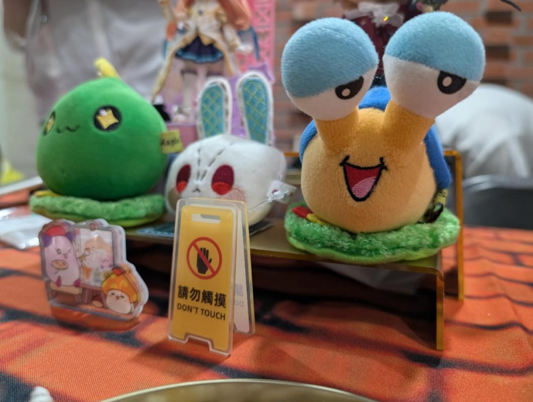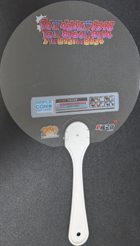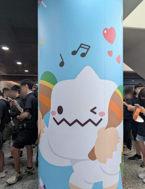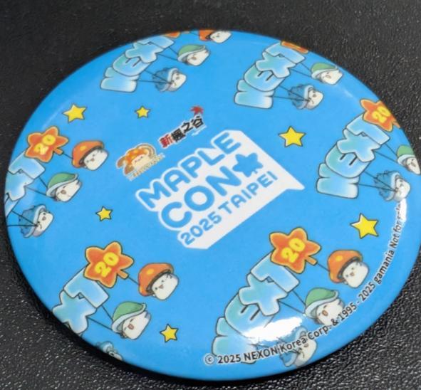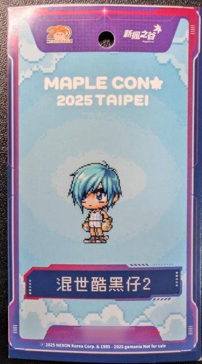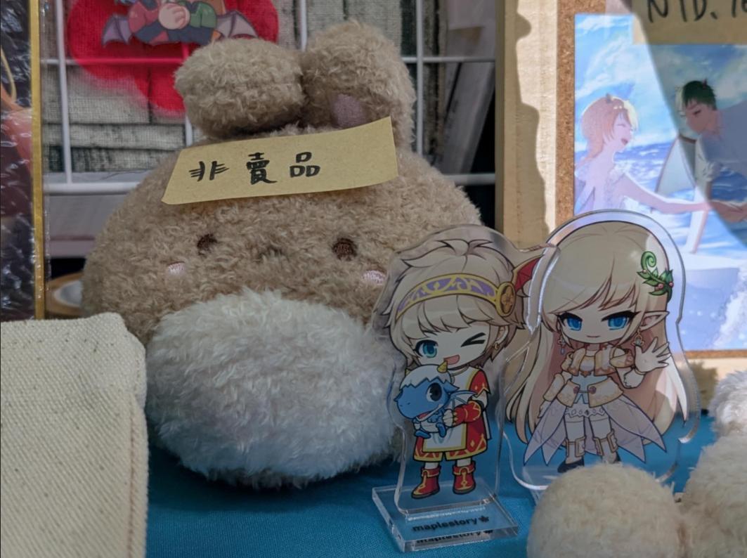 其實這時候我想趕快領虛寶,只知道在大廳可以領,但這時候大廳塞滿了人潮,根本無法判斷哪個是排隊隊伍是排向領虛寶的,也不知道領虛寶的櫃台到底在哪一側。途中,我也有問工作人員及聽到別人問工作人員後的回答。後來就在主要場地內逛了逛,除了看了二創攤商,拍了些不錯的商品外,也拍了些以楓之谷遊戲內背景作為背板的圖案。