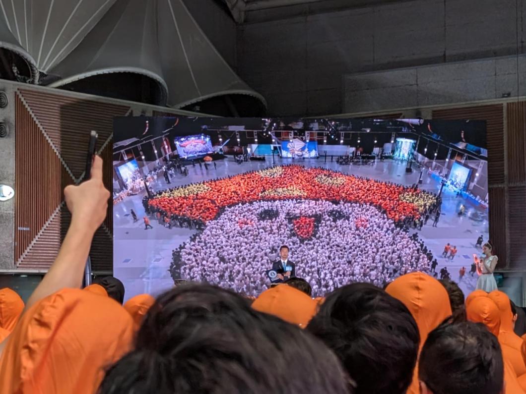 再來就是不同區的人依序被帶進來並排成適當的隊伍,而這些隊伍的排成會影響到空照圖所見的菇菇寶貝之呈現形狀。主持人也有請我們面向前方螢幕,螢幕上有顯示即時畫面。這些畫面由現場工作人員的手持攝影機及好幾個空拍機所輪播,但主要呈現畫面還是由參加者們拼成的菇菇寶貝。