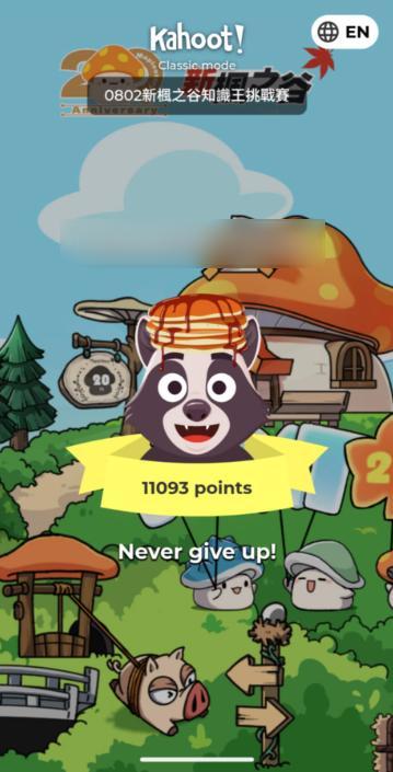 快 15:00 的時候,主持人在舞台上宣布「榮耀學測:好楓寶知識王」活動準備開始 (預計 15:00 開始)。這個活動是知識答題,官方採用的軟體則是 Kahoot!。我是用自己手機的網路,掃描舞台背後大螢幕上所顯示的 QR 碼後,連了一段時間才進到遊戲大廳,不過連進去後的網路倒是算順的。我一開始還坐在舞台前面不遠處答題,當時也有不少人也是坐著答題,真的很有種《獵人》舊版動畫貪婪之島篇結尾-小傑、奇犽等人和其他玩家坐在草地上答題時的感覺。