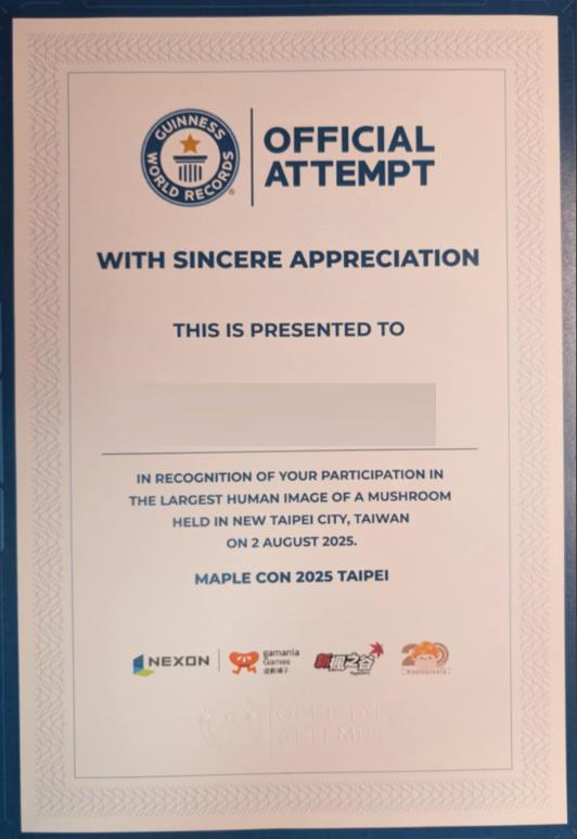 雖然通常參與線上遊戲的相關實體活動的動機,虛寶對我占了一大因素,但這次一大部分也是為了挑戰金氏世界紀錄而來。這次要挑戰金氏世界紀錄在參加證書上是寫「The Largest Human Image of a Mushroom」,中文翻譯大概是:最大的人類圖案拼成的蘑菇,而我們參與金氏挑戰者們所要拼的就是菇菇寶貝的圖案。