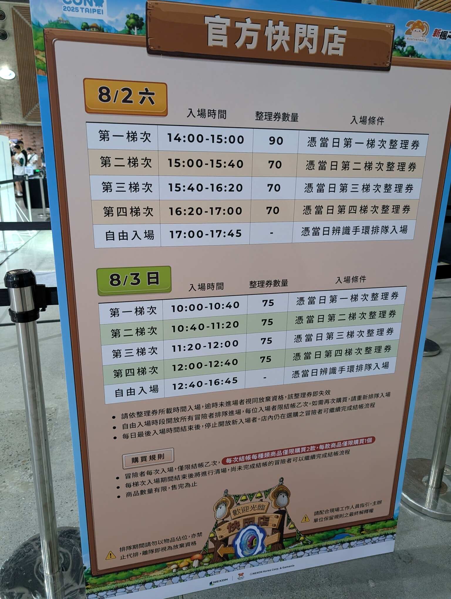 排隊時,還有一位應該也是參加者的仁兄不斷詢問著隊伍中的人是幾號,結果他發現有排在第一個隊伍的人是 1~300 號之間,也有人是 301~600 號之間我還看到隔壁隊伍的。我還看到有右手邊隊伍的人在拿一本應該是 SCP 相關的書籍,我是從我瞄到的內容而推測的。倒是都沒看到有人在玩 MapleStory Worlds 上的遊戲,如:Artale。