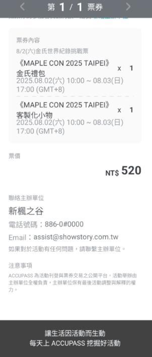 這次的購票方式為在 ACCUPASS 上購買,我購買票價是新台幣520元。票券內容在 ACCUPASS 的顯示為:8/2 (六) 金氏世界紀錄挑戰票、《MAPLE CON 2025 TAIPEI》金氏禮包 x1、《MAPLE CON 2025 TAIPEI》客製化小物 x1。
