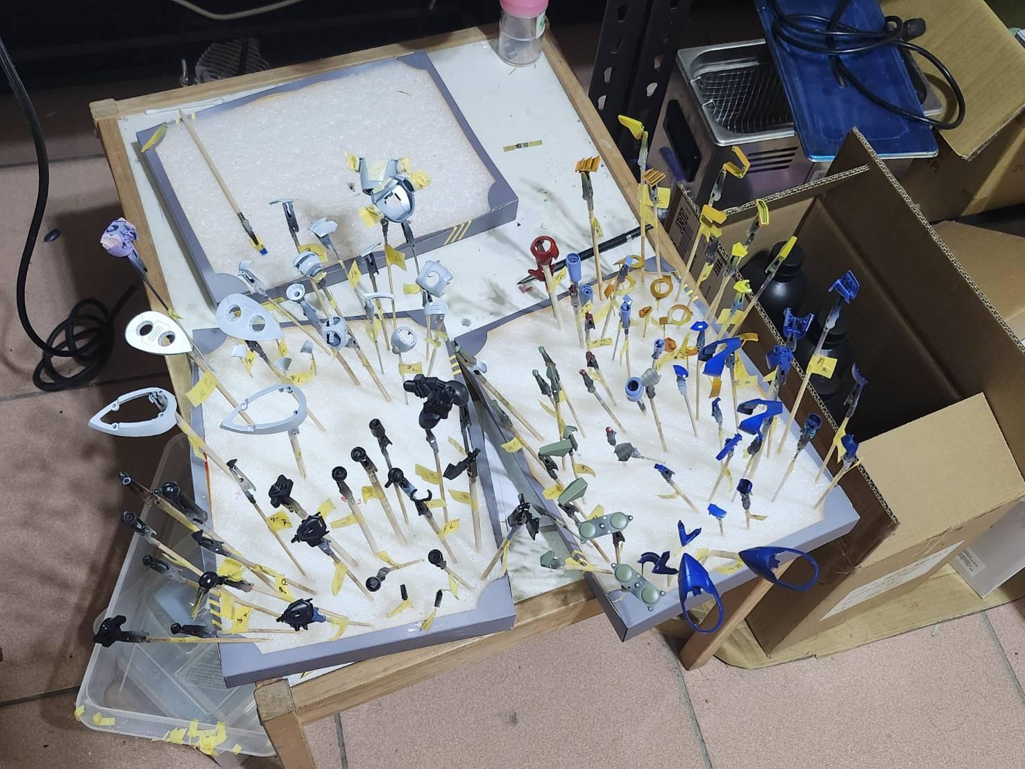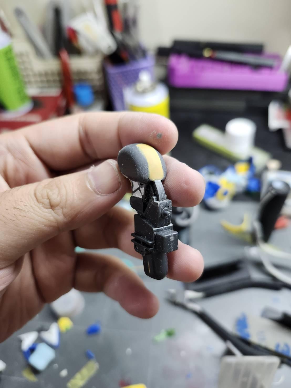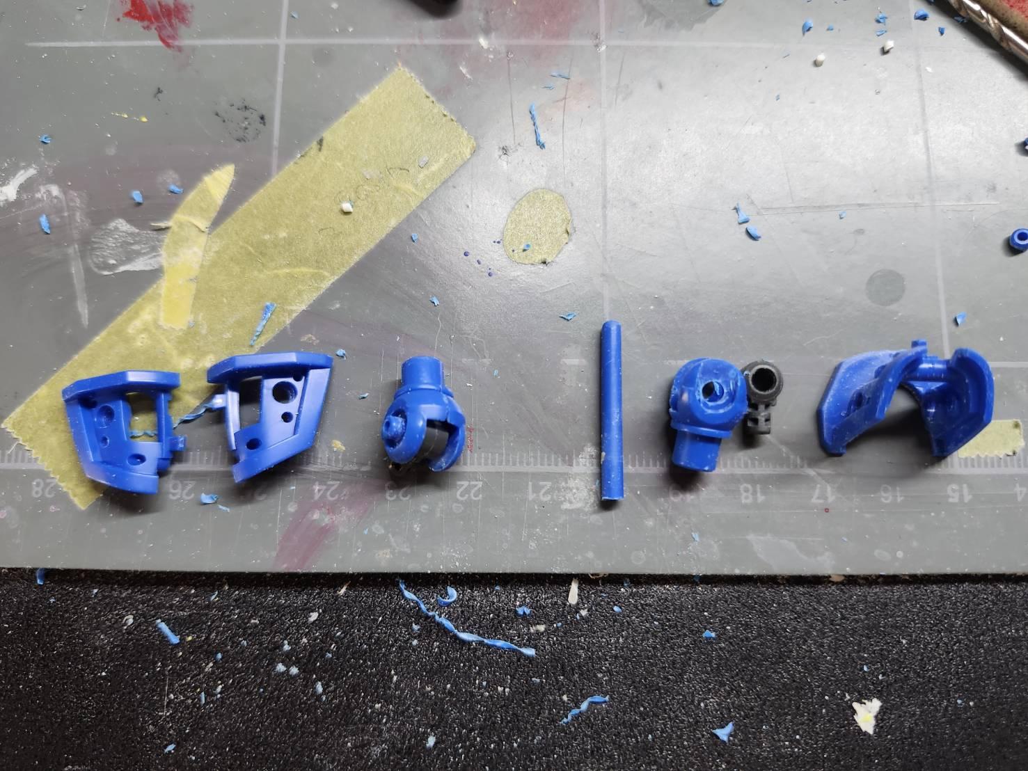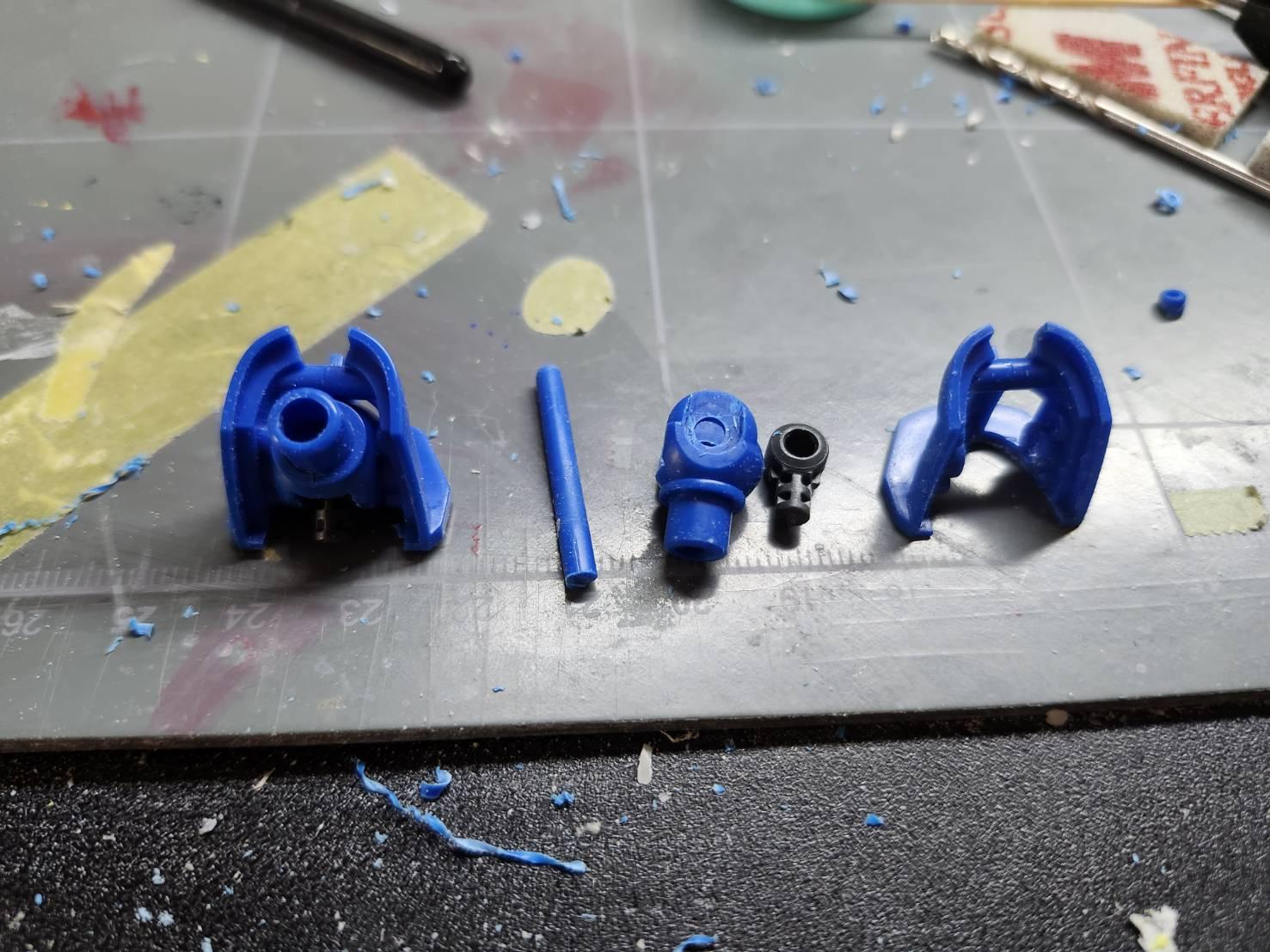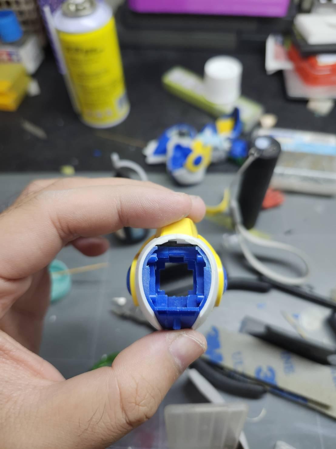 而要改成使用挖曹導入的方式進行外肩甲固定,隨後將框架做成圓棒固定,再組裝外甲前插進去再將外甲黏起來