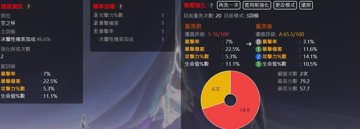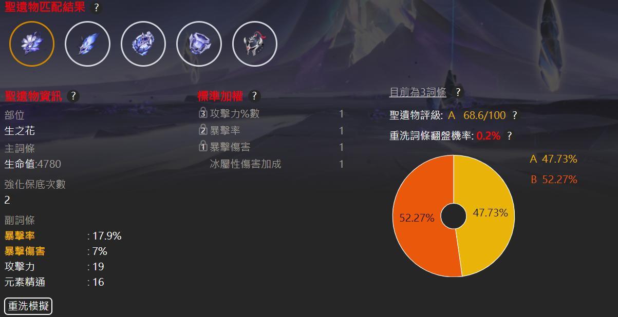 左側的聖遺物資訊黃字為你選取的有效詞條,中間的資訊為你稍早制定的加權,右側會顯示該聖遺物的評級以及翻盤機率。