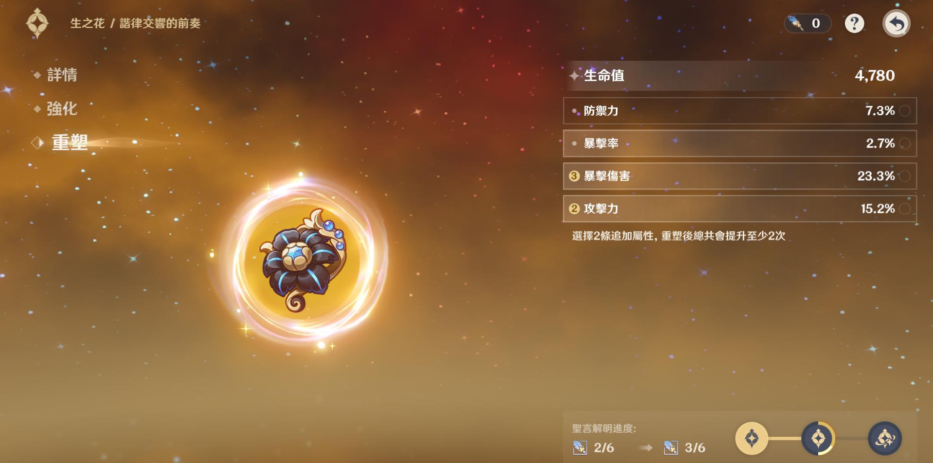 先簡單講一下啟聖之塵的用途。他可以讓你的聖遺物獲得一次重生的機會,可以重新分配強化次數至副詞條上。而且這個的道具有個蠻好的地方就是他有保底機制,而且可以透過使用的量有條件的加高保底詞條數,算是不錯的改動。不過目前啟聖之塵獲得管道仍十分有限,不建議隨便使用。此外這個道具的出現衍生幾個問題......。