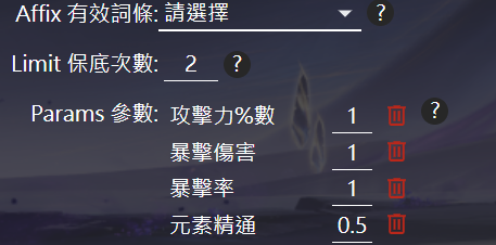 每個詞條最右邊有個勾選框,勾選的兩個詞條將享有保底強化機制。像我上面想要雙暴優先,就直接勾選雙暴即可。接下來決定有效詞條種類,這邊可以選最多六個詞條,並且各自決定權重比例。拿這件為例:我想要雙暴、大攻擊、精通。精通的比重沒那麼重設0.5即可。那麼有效詞條會如下所設定。