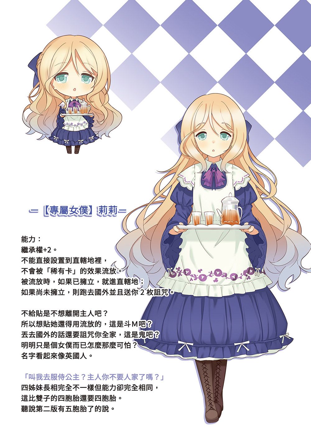 不過第二版的五胞胎裡面莉莉特別強,強到擁立前就出現的話先買來卡手都完全值得的程度,就是這麼誇張。其他就菩提的撒詛咒還算有點威力,再來的就是很普通的 4 費買「瞬間」2 分的效果程度而已。果然女僕之間還是有所位的「格差」的。