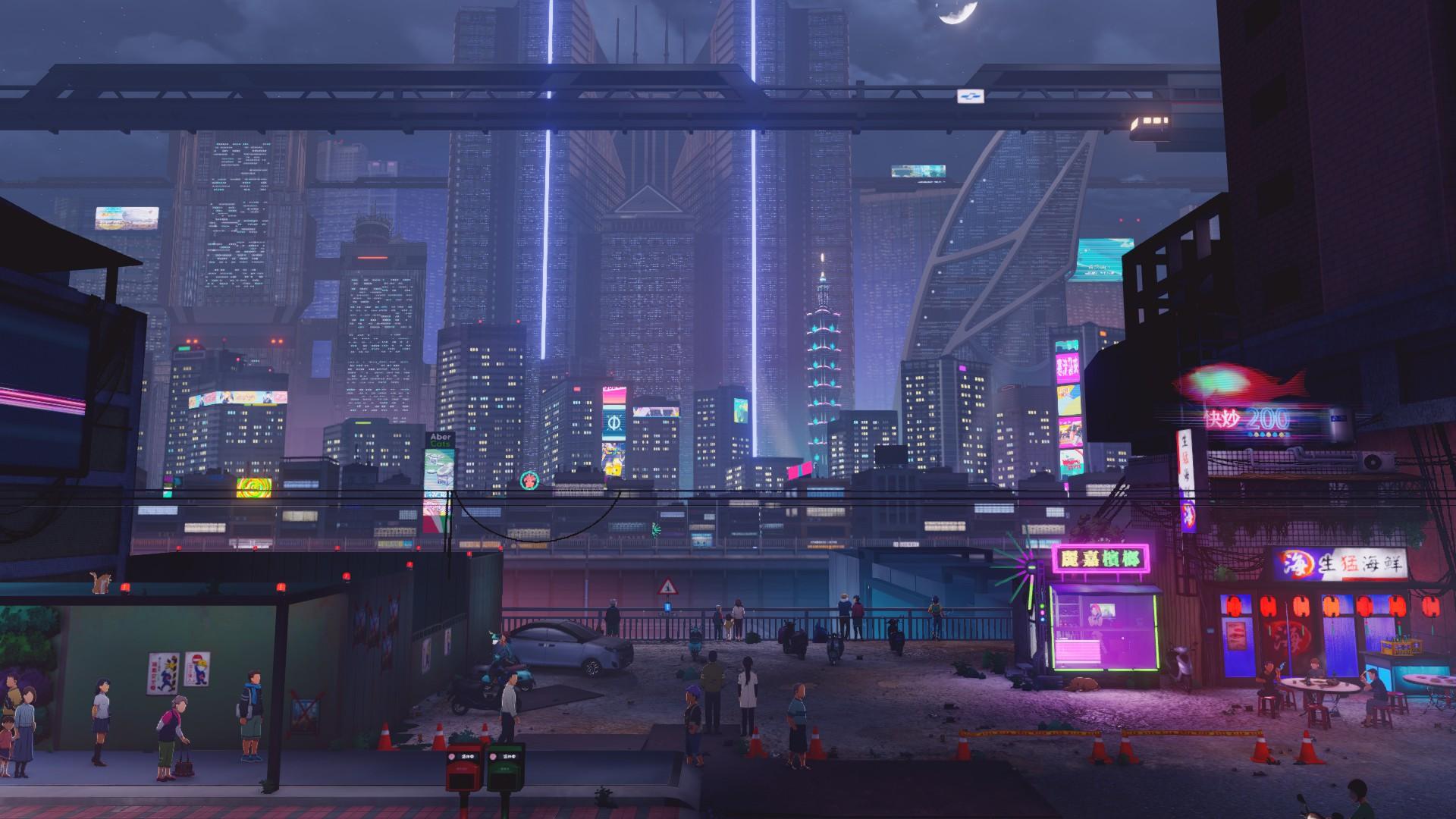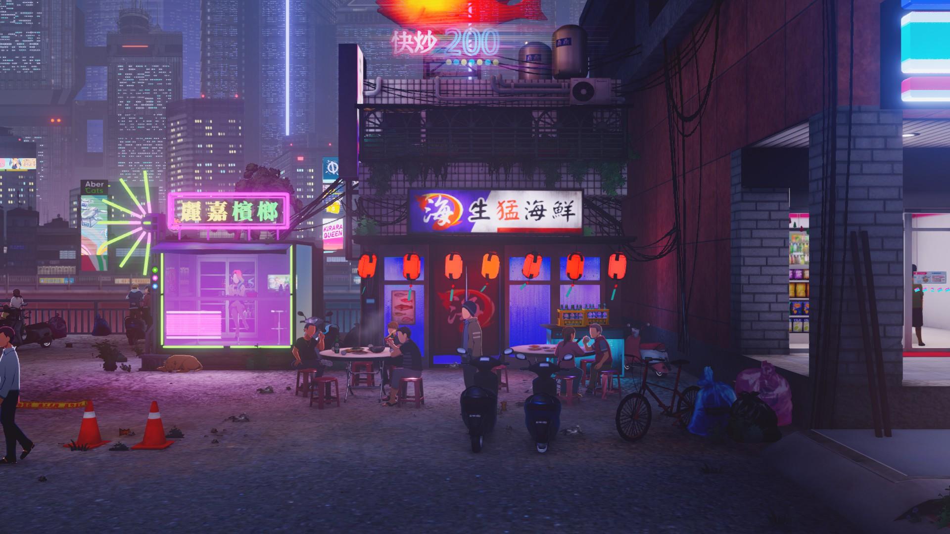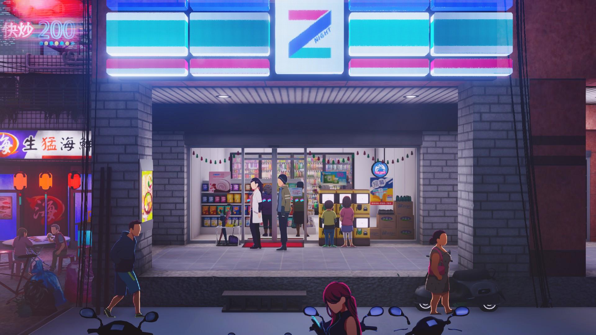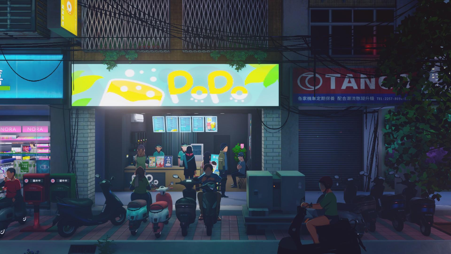 本作以虛構的未來台灣為主,我們操作的男主角戴士傑居住於灣北(其實就是台北啦!)在遊戲的刻畫中可以看到賽博龐克的元素融入了我們熟悉的台灣景色──台北101在遊戲中成了不高的建築、近未來的台灣人依然騎機車、街邊依舊有雞蛋糕與熱炒店,甚至有知名早餐店或者網紅的手搖杯飲料店。這些小地方讓虛構的世界帶著真實的溫度。