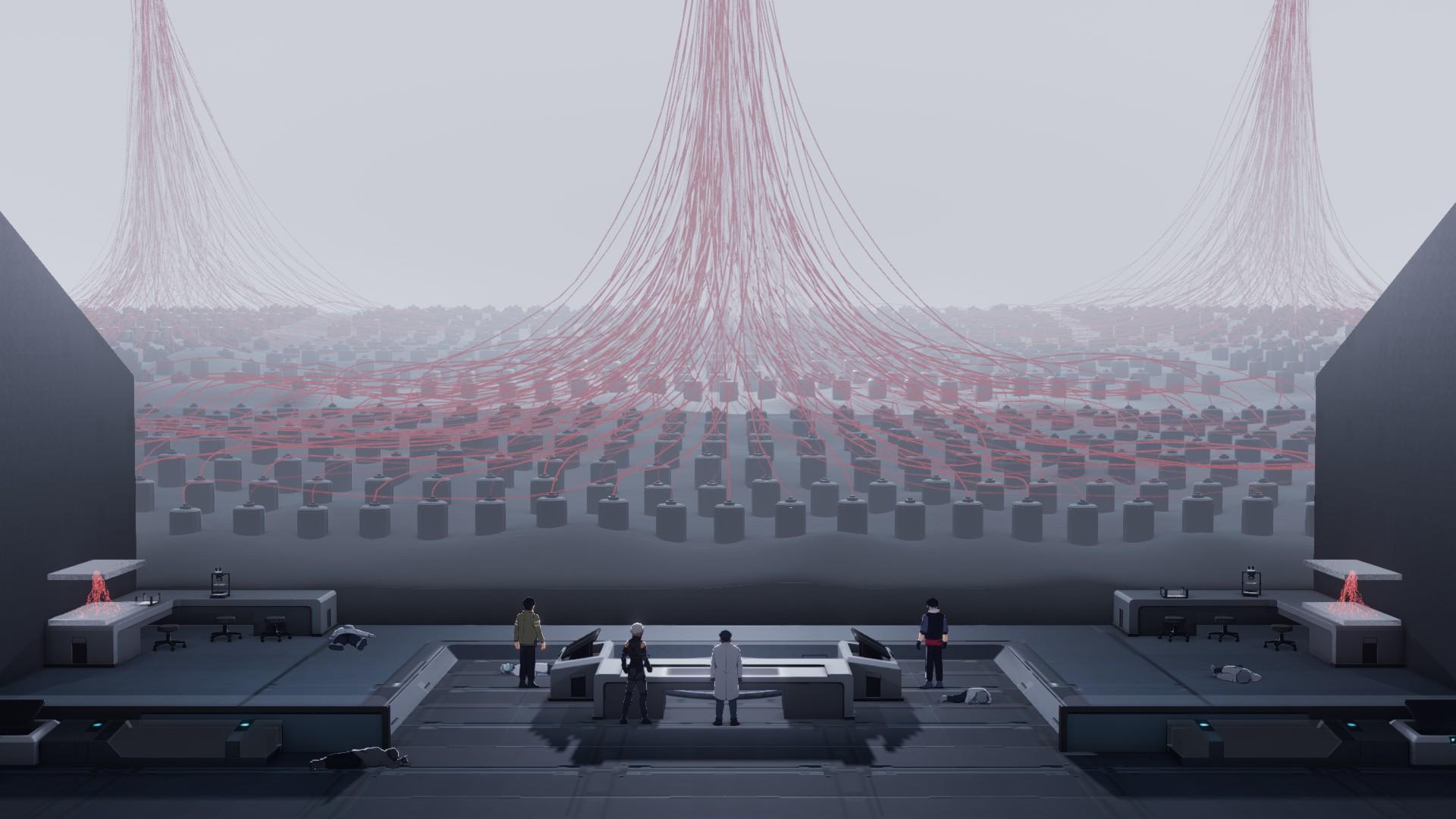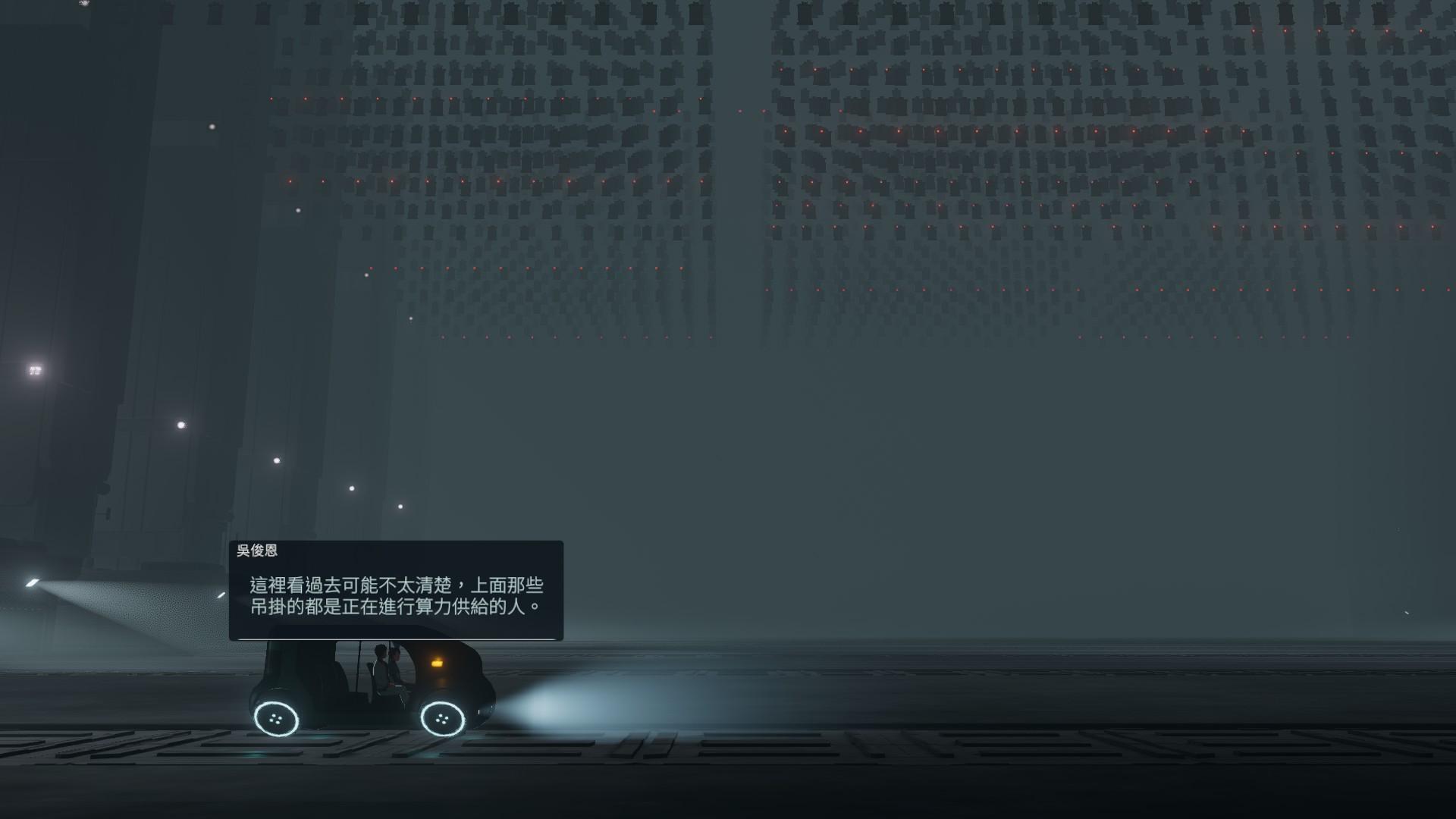 當我第一次遊玩到操作組的地下工廠,搭著小車穿越這一片吊掛著所有提供算力被「榨腦」的人民時,心裡還是頗震撼的。公司掩蓋的秘密,人民對於算勞的憧憬等等,都在霓虹閃爍的賽博世界中被隱藏於此。
