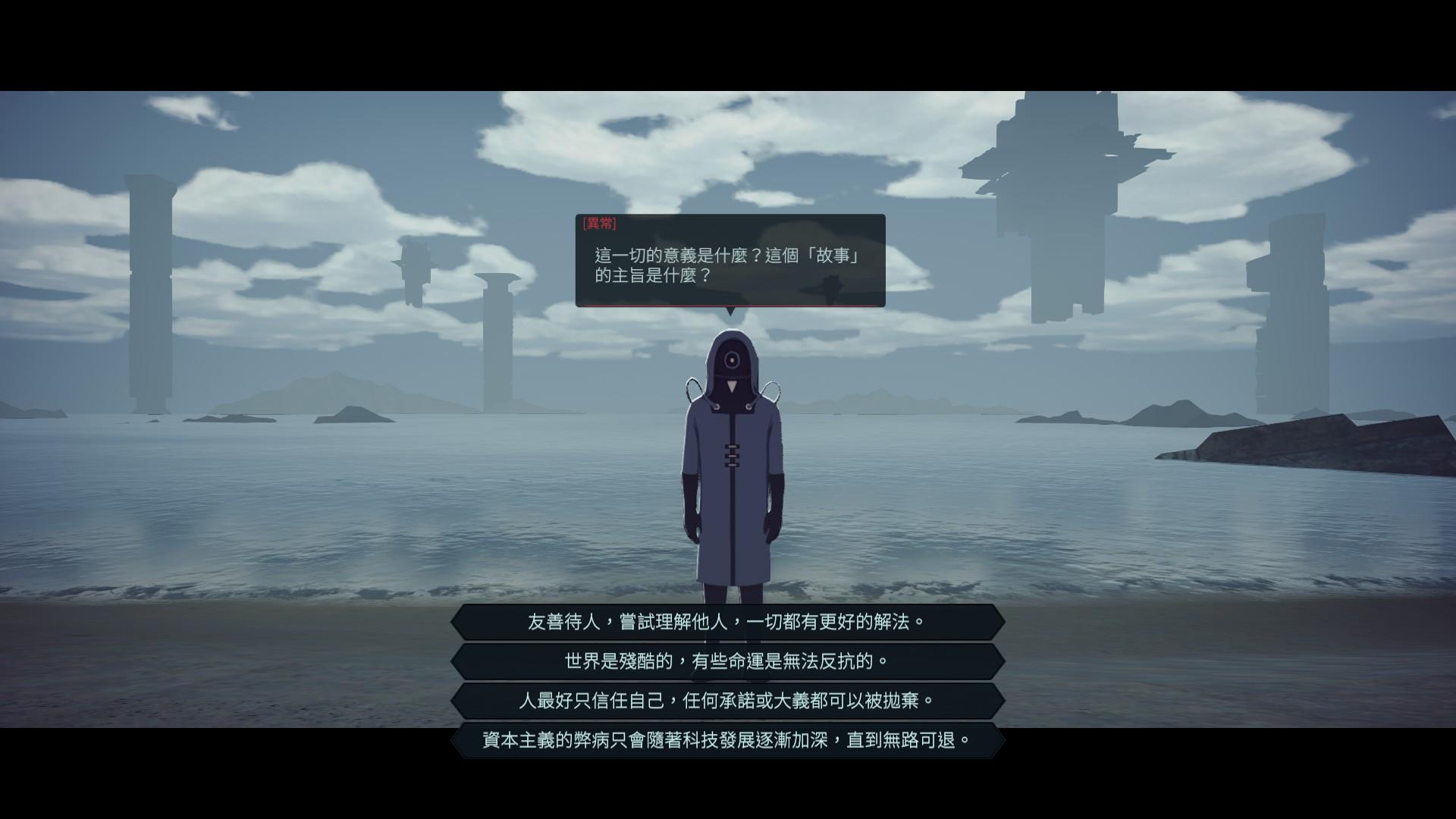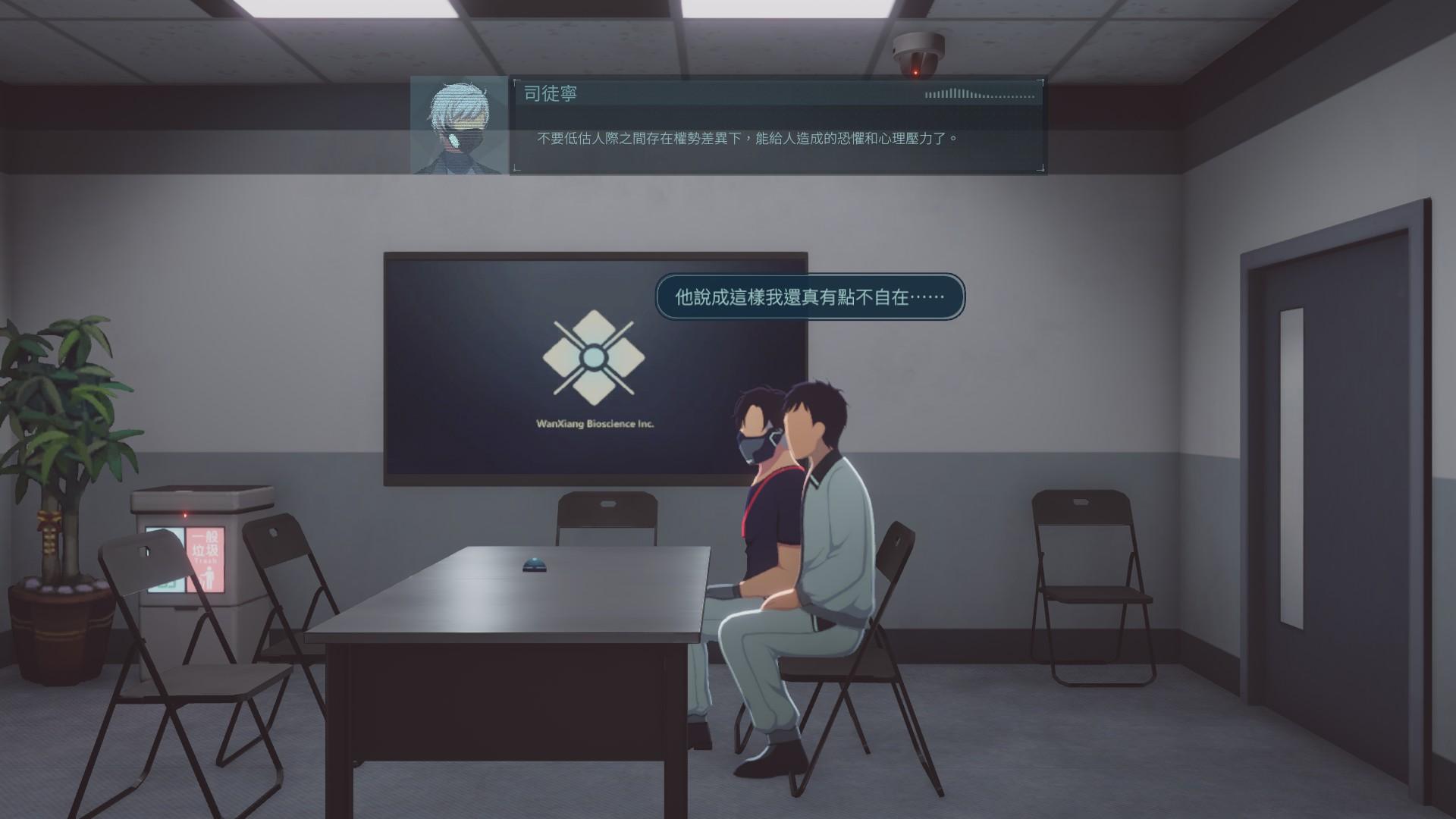 4. 需要一口氣給他玩完,不適合中途插隊:與之前介紹過的《雨港基隆》或者《東周列萌志》不同,雖然三款都是對話推動劇情導向遊戲,《沉沒意志》非常需要一氣呵成打通關,不然可能會有劇情或者角色的理解困難。我在遊玩本作的時候,剛好接到教召通知所以有一週沒辦法遊玩,當我要回來上手時真的是有一度想說我到底之前玩了什麼?可能是因為人物多,且每一個對話牽一髮而動全身,突然銜接起來然後看著其他角色對於主角的反應,都會想:「我之前到底跟你說了什麼讓你現在用這個態度對我?」