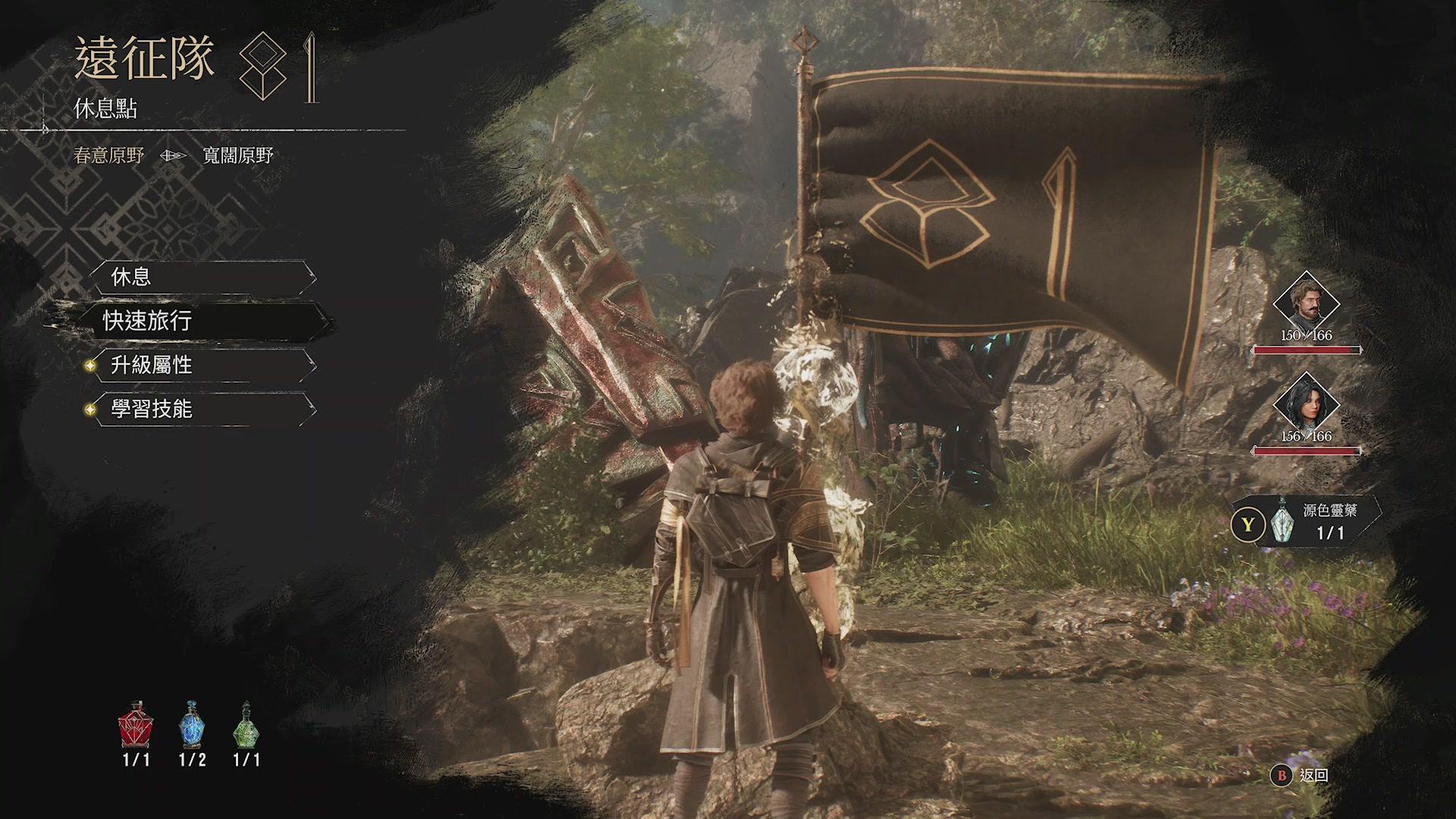 每走一小段路就有代表休息點旗幟也是這款遊戲非常像動作遊戲的地方,一般RPG遊戲並不會有這麼多休息點,而休息時也會如黑魂類動作遊戲同樣,重置已擊敗的嘍嘍敵人與所有補給道具